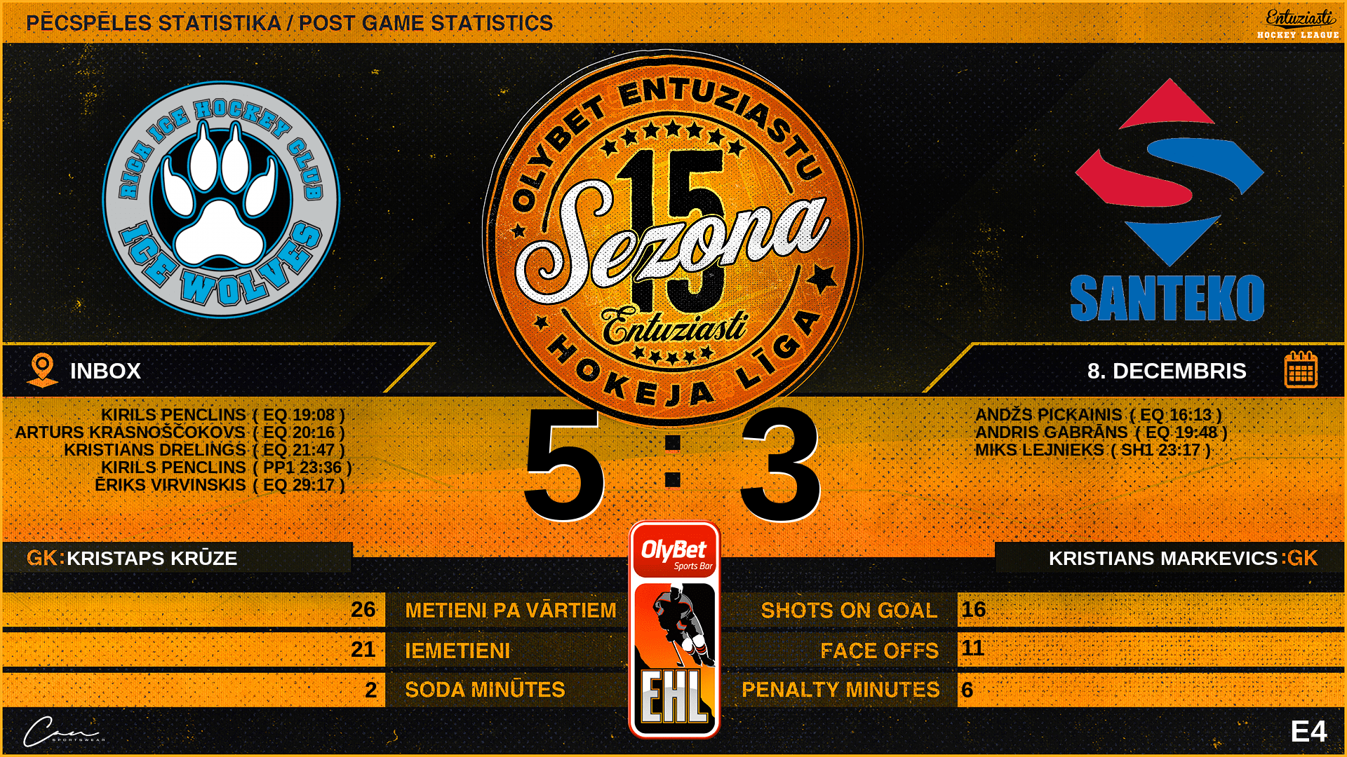 | 16:13 | SAN | Vārti (EQ) | #89 Andžs Pickainis, piespēles: #73 Aleksandrs Ruhovs, #61 Jānis Sīviņš |