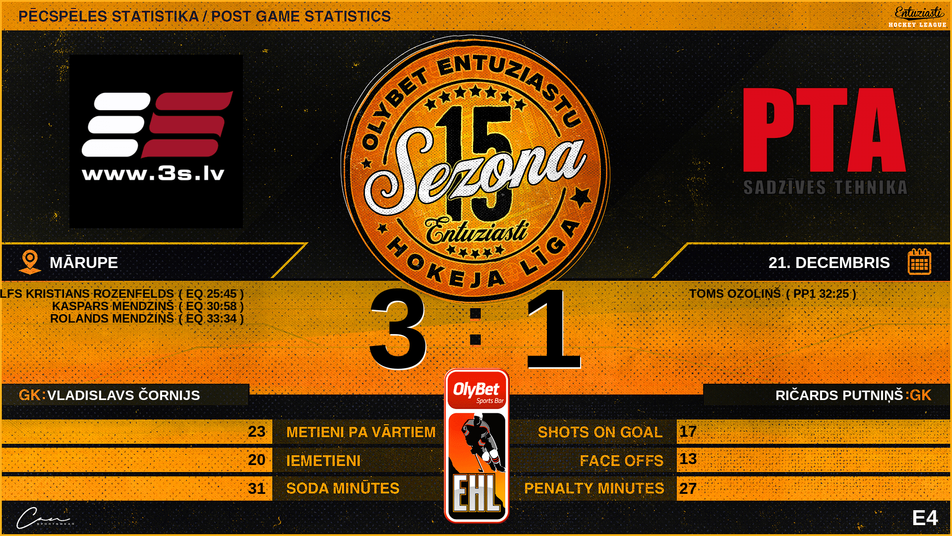 | 33:34 | 3S | Vārti (EQ) | #10 Rolands Mendziņš, piespēles: #64 Kaspars Mendziņš, #97 Viktors Straume |