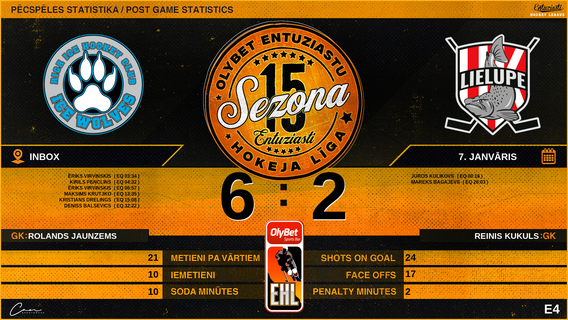 | 06:57 | WF2 | Vārti (EQ) | #28 Ēriks Virvinskis, piespēles: #62 Daniels Stepanovs |