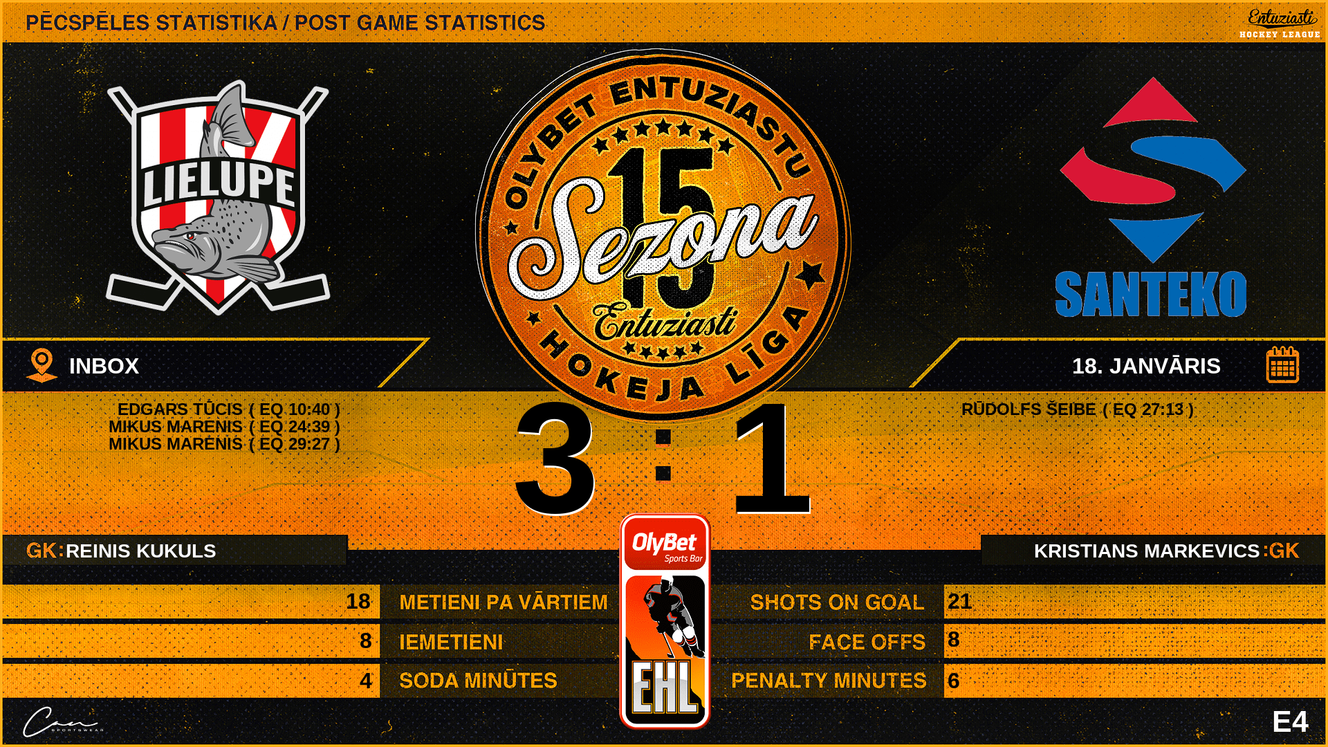 | 24:39 | LLP | Vārti (EQ) | #99 Mikus Marenis, piespēles: #97 Jānis Āboltiņš, #66 Mareks Bagajevs |