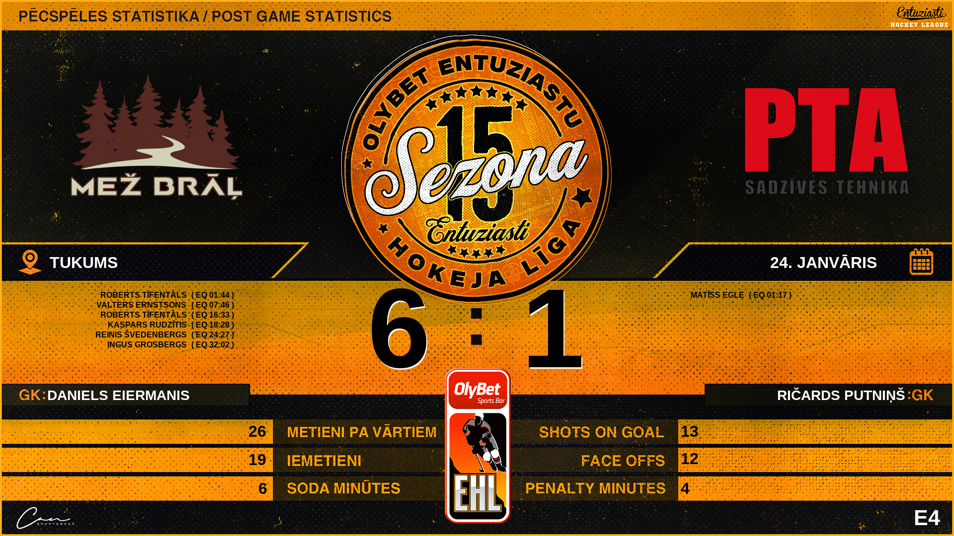| 01:17 | PTA | Vārti (EQ) | #24 Matīss Egle, piespēles: #19 Toms Ozoliņš |