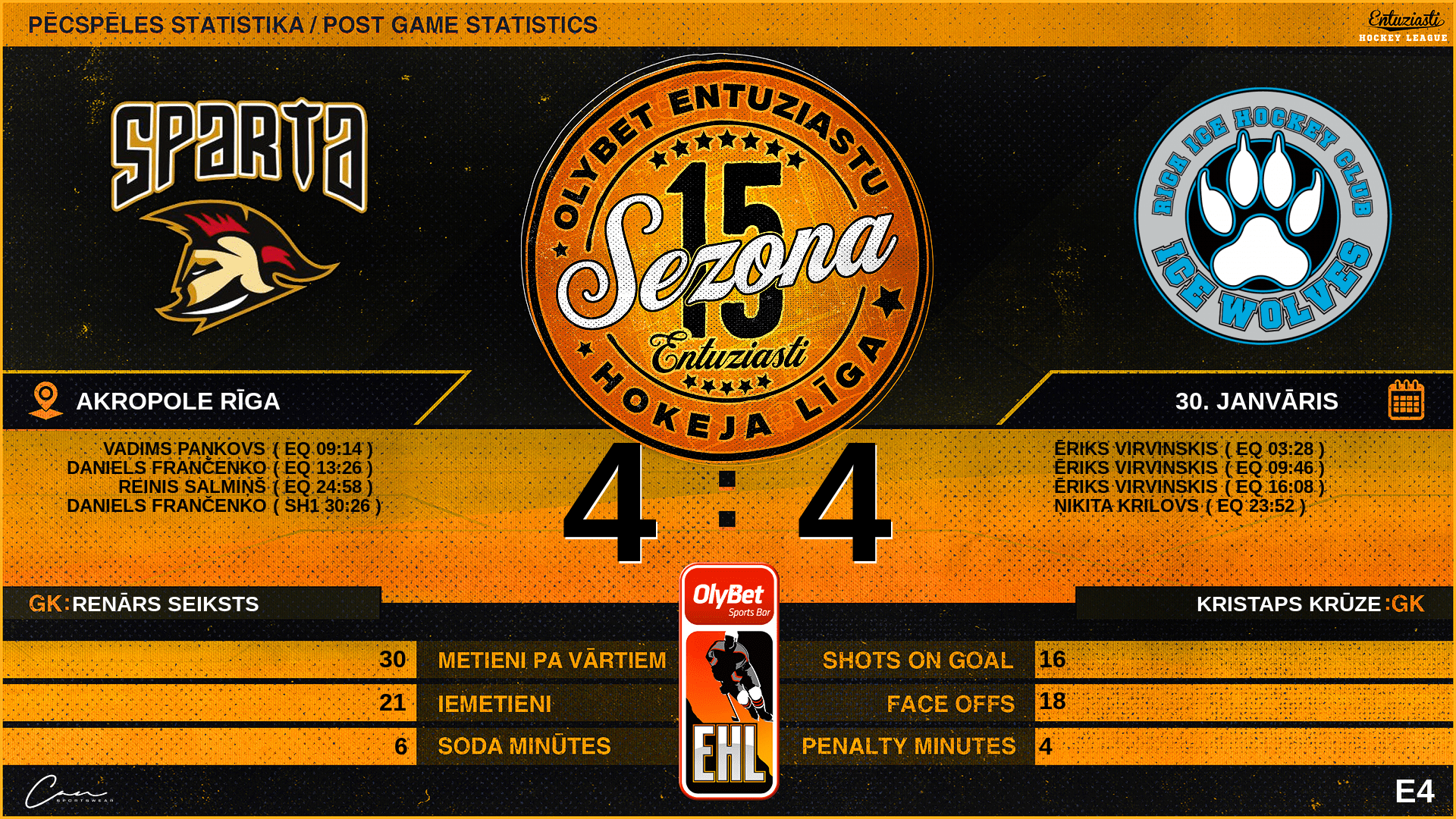 | 03:28 | WF2 | Vārti (EQ) | #28 Ēriks Virvinskis, piespēles: #97 Rojs Skrebels |
