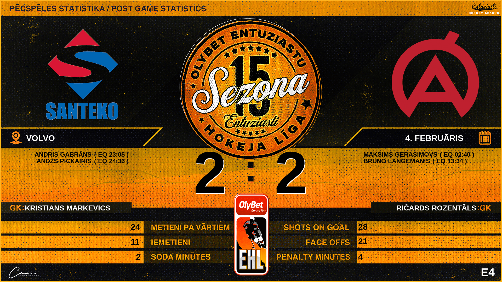 | 13:34 | ATA | Vārti (EQ) | #19 Bruno Langemanis, piespēles: #93 Rolands Āboliņš, #8 Uvis Norde |