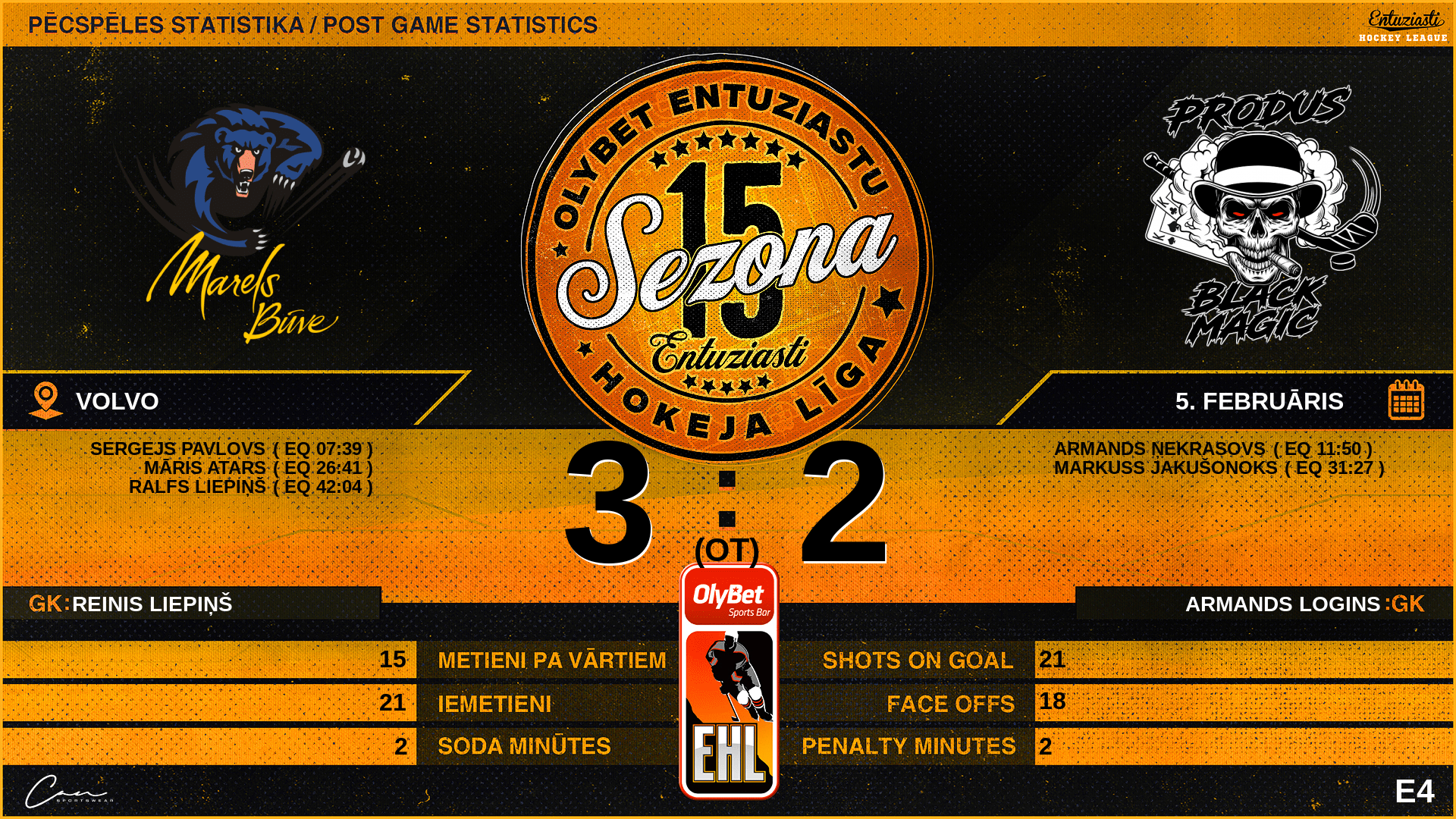 | 42:04 | MB2 | Vārti (EQ) | #4 Ralfs Liepiņš, piespēles: #24 Oskars Grizāns, #71 Sergejs Pavlovs |