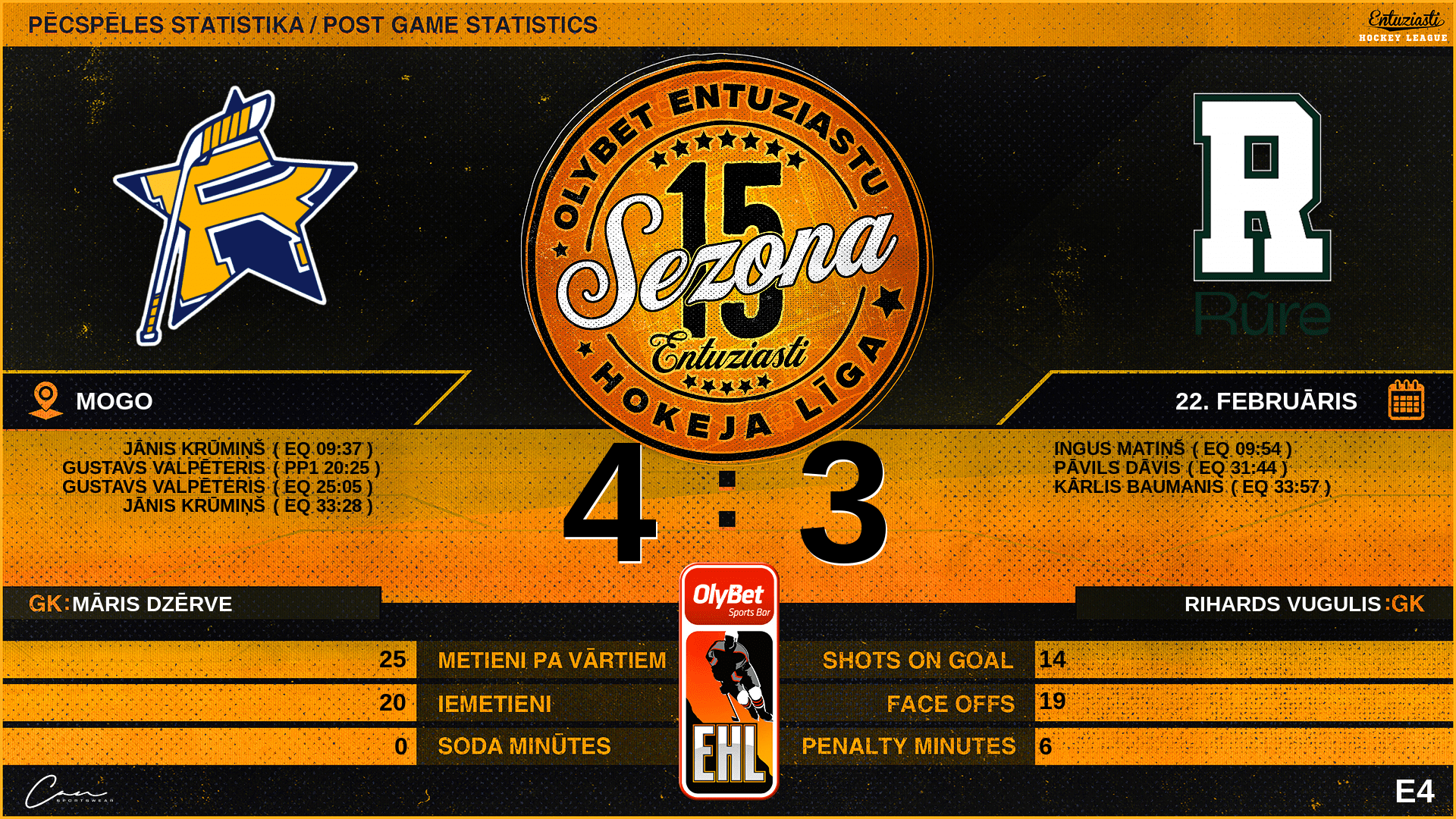 | 31:44 | RUR | Vārti (EQ) RP2 3 : 2 RUR | #86 Pāvils Dāvis, piespēles: #6 Viesturs Morozs |