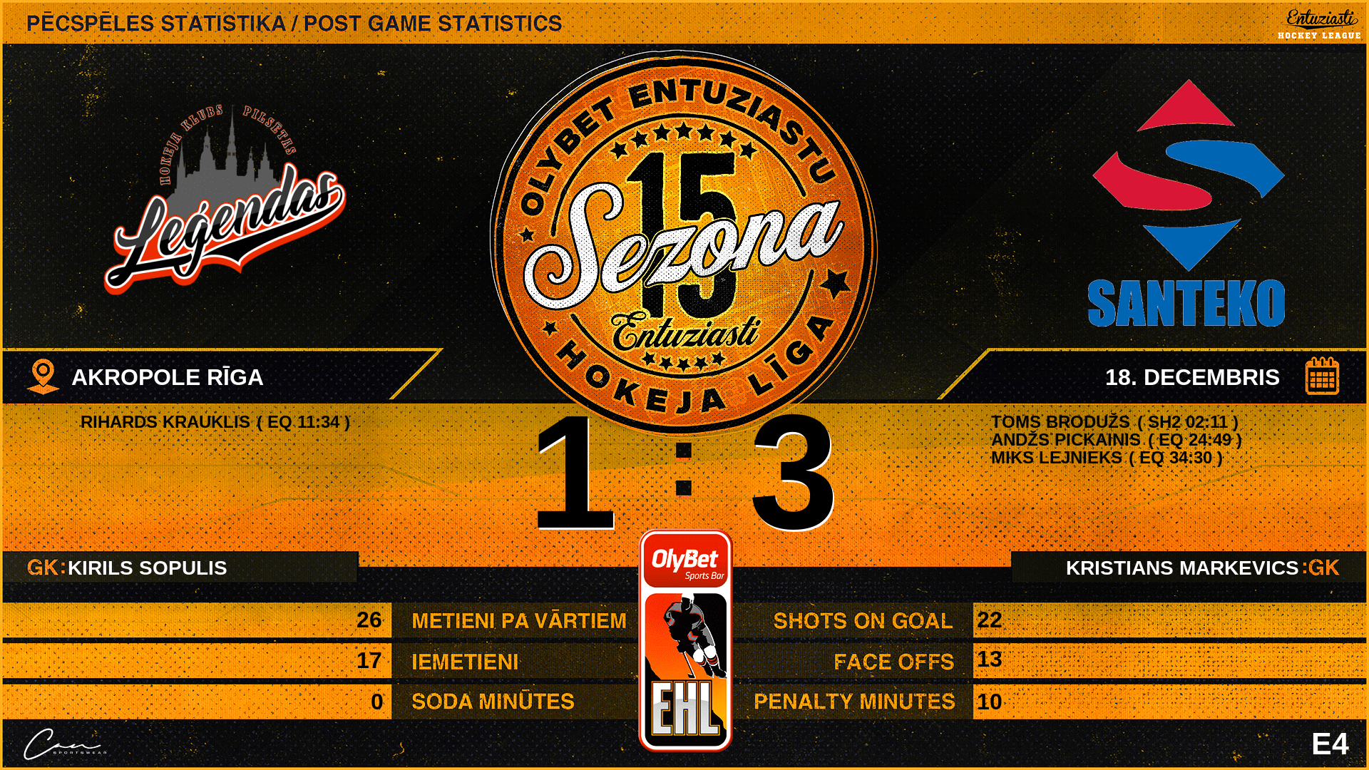 | 34:30 | SAN | Vārti (EQ) | #92 Miks Lejnieks, piespēles: #26 Antons Babuškins |
