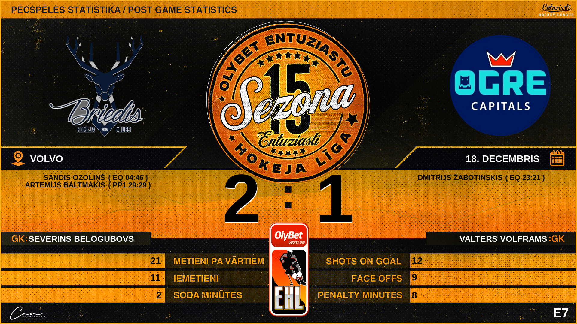 | 23:21 | OCP | Vārti (EQ) | #61 Dmitrijs Žabotinskis, piespēles: #80 Arnis Grīnbergs |