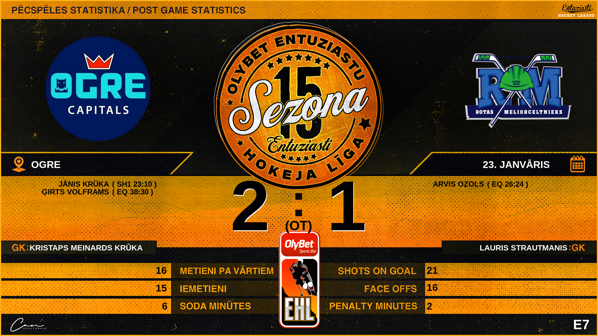 | 23:10 | OCP | Vārti (SH1) | #97 Jānis Krūka, piespēles: #33 Ģirts Vīksna |