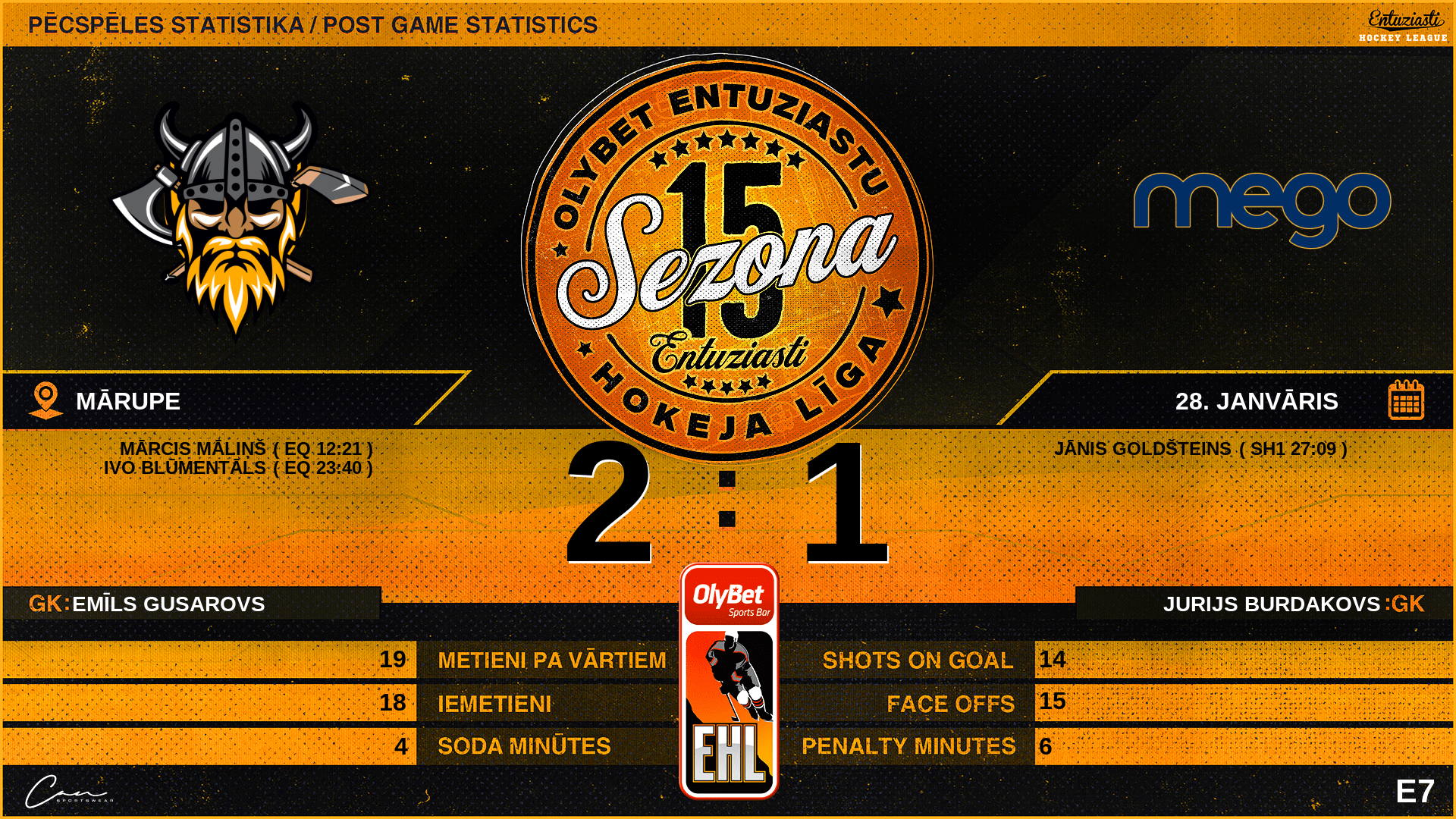 | 27:09 | MGO | Vārti (SH1) VN2 2 : 1 MGO | #70 Jānis Goldšteins |