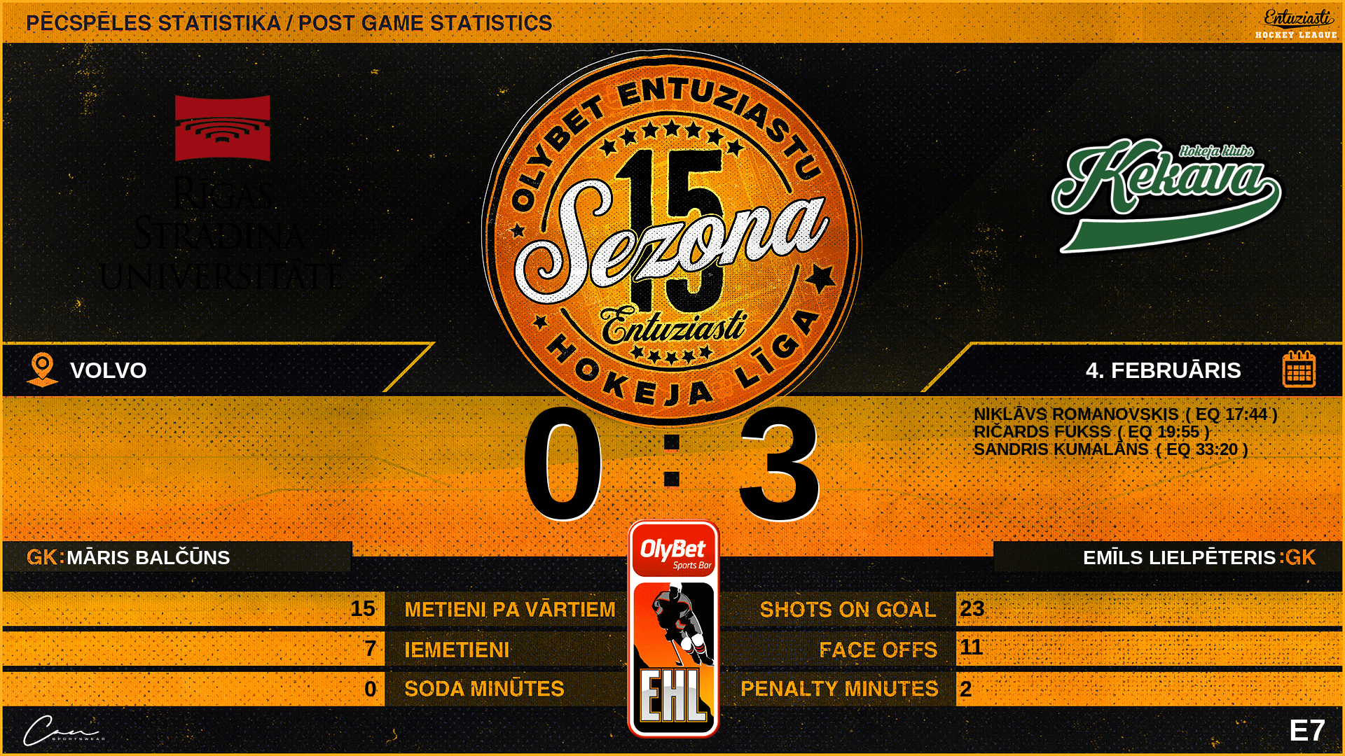 | 33:20 | ĶE3 | Vārti (EQ) | #5 Sandris Kumalāns, piespēles: #67 Niklāvs Romanovskis |