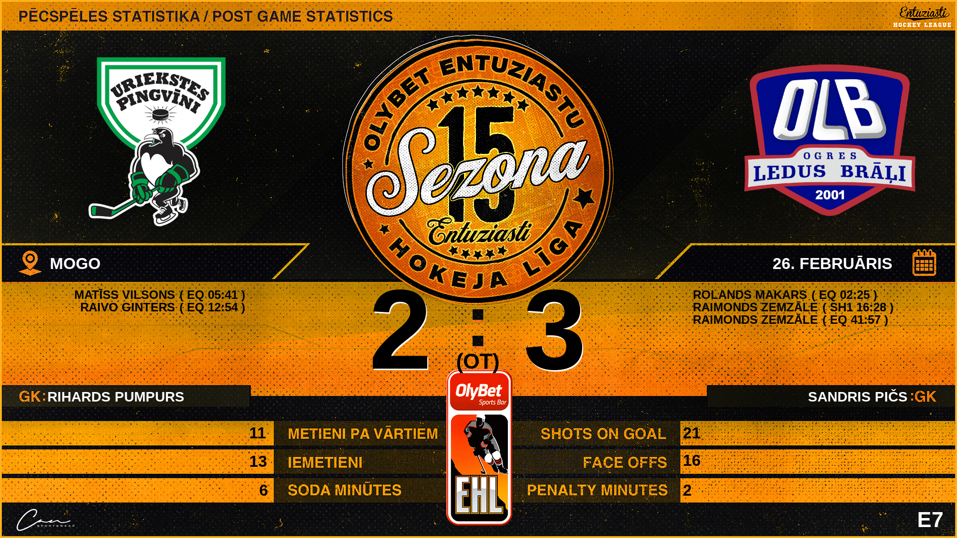 | 41:57 | OL2 | Vārti (EQ) UPG 2 : 3 OL2 | #42 Raimonds Zemzāle |
