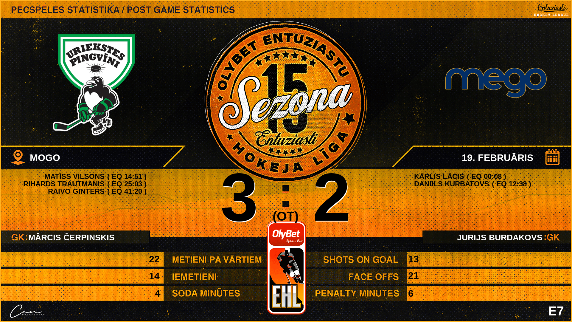 | 41:20 | UPG | Vārti (EQ) UPG 3 : 2 MGO | #24 Raivo Ginters, piespēles: #25 Rolands Ramans, #14 Kristaps Rudzītis |