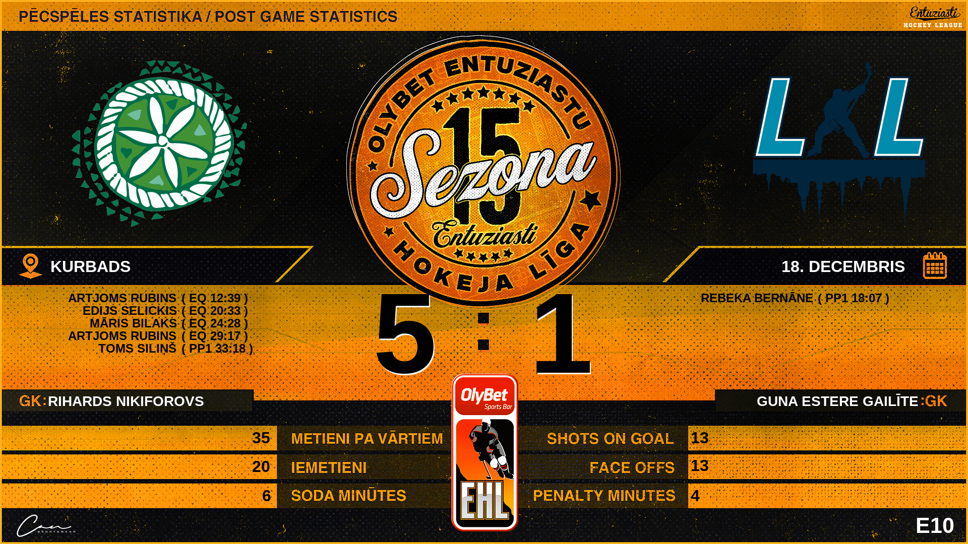 | 33:18 | PC3 | Vārti (PP1) | #88 Toms Siliņš, piespēles: #83 Guntars Lazdiņš |