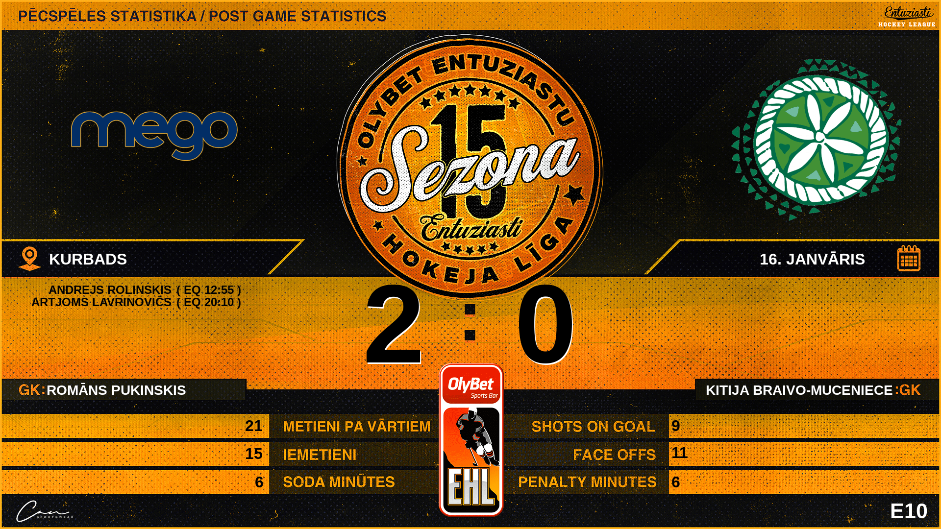 | 12:55 | MG2 | Vārti (EQ) | #32 Andrejs Rolinskis, piespēles: #97 Rinalds Vigups, #80 Artjoms Lavrinovičs |