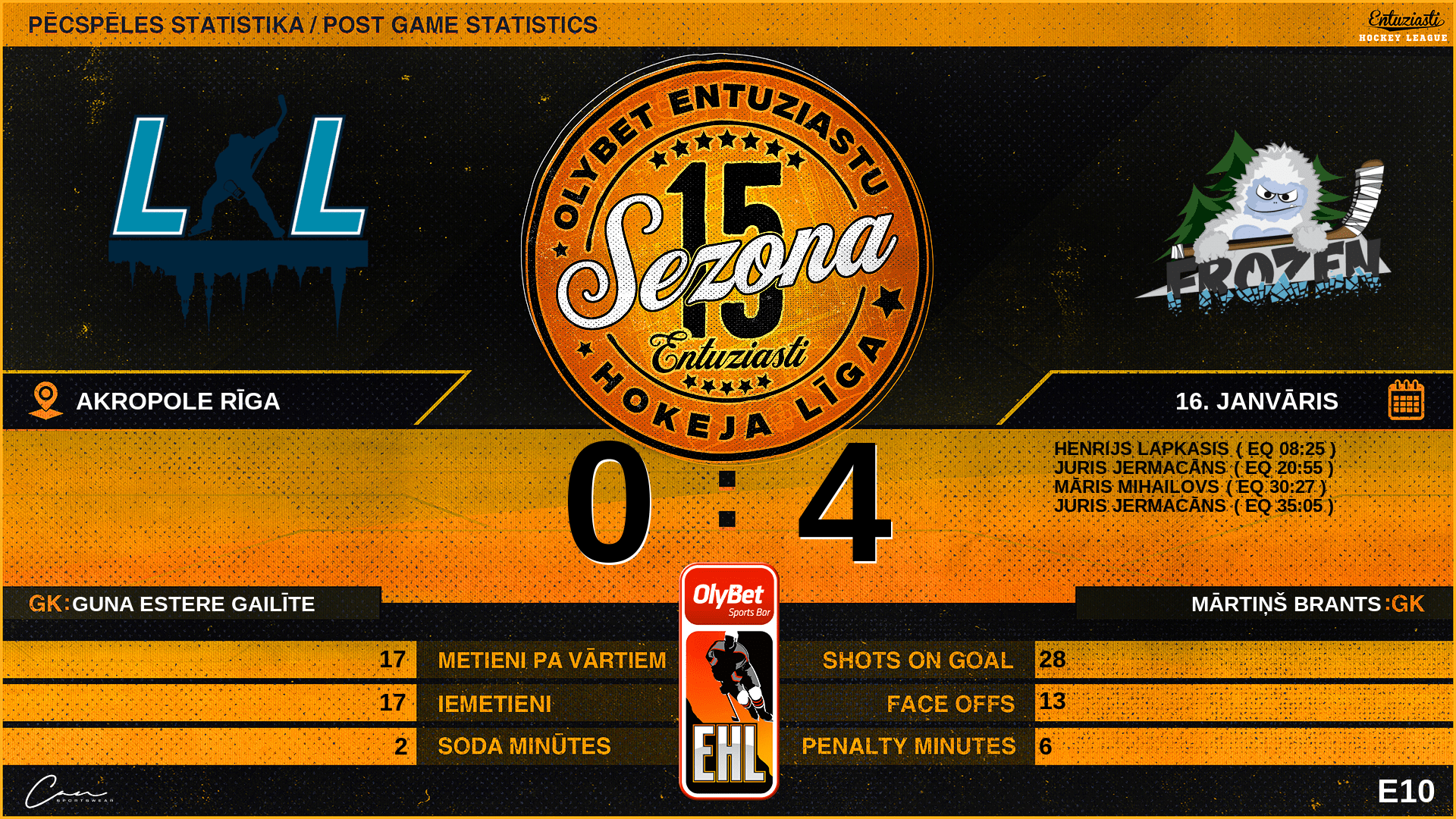 | 20:55 | FRZ | Vārti (EQ) | #31 Juris Jermacāns |