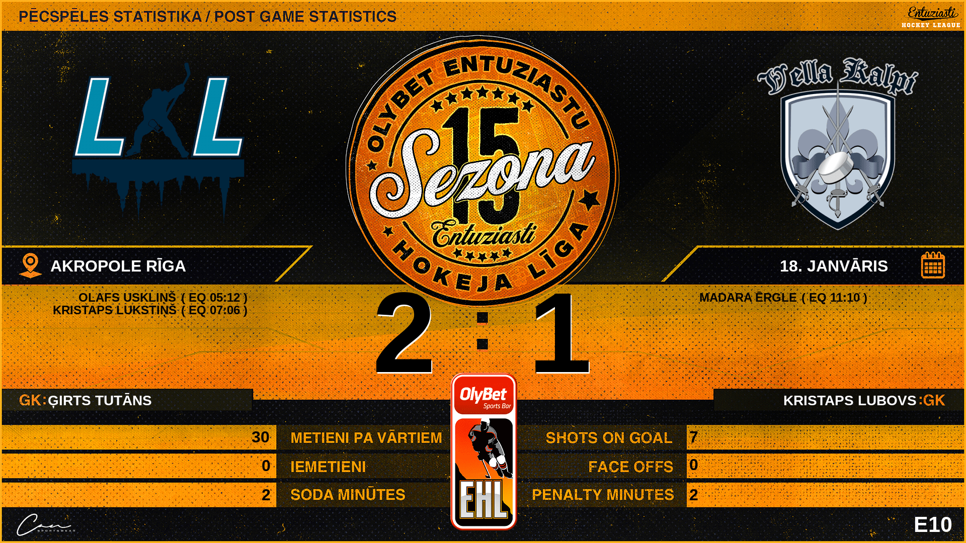 | 05:12 | LST | Vārti (EQ) | #68 Olafs Uskliņš, piespēles: #69 Rojs Eglītis, #83 Edgars Treimanis |