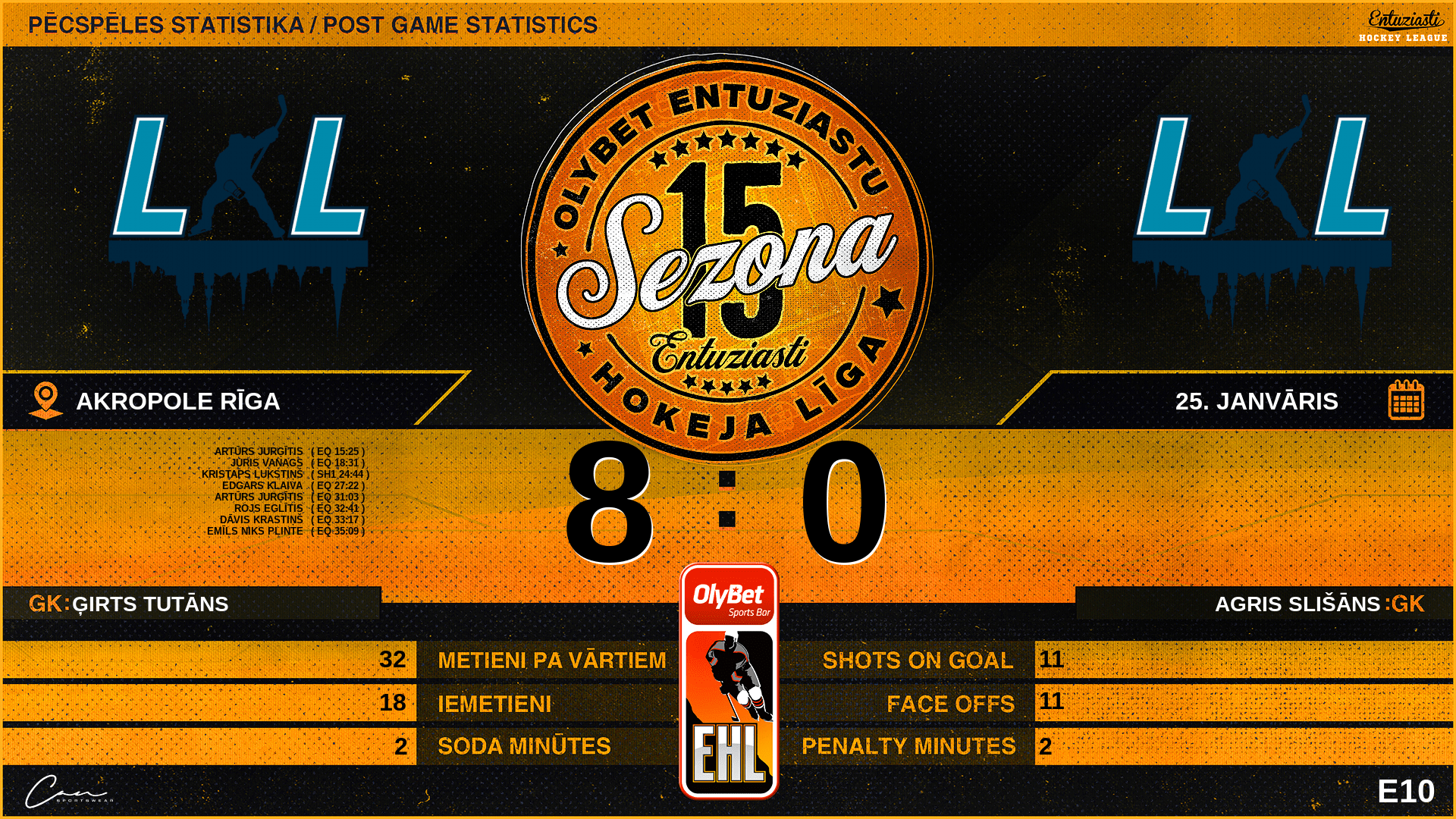 | 35:09 | LST | Vārti (EQ) | #20 Emīls Niks Plinte, piespēles: #68 Olafs Uskliņš |