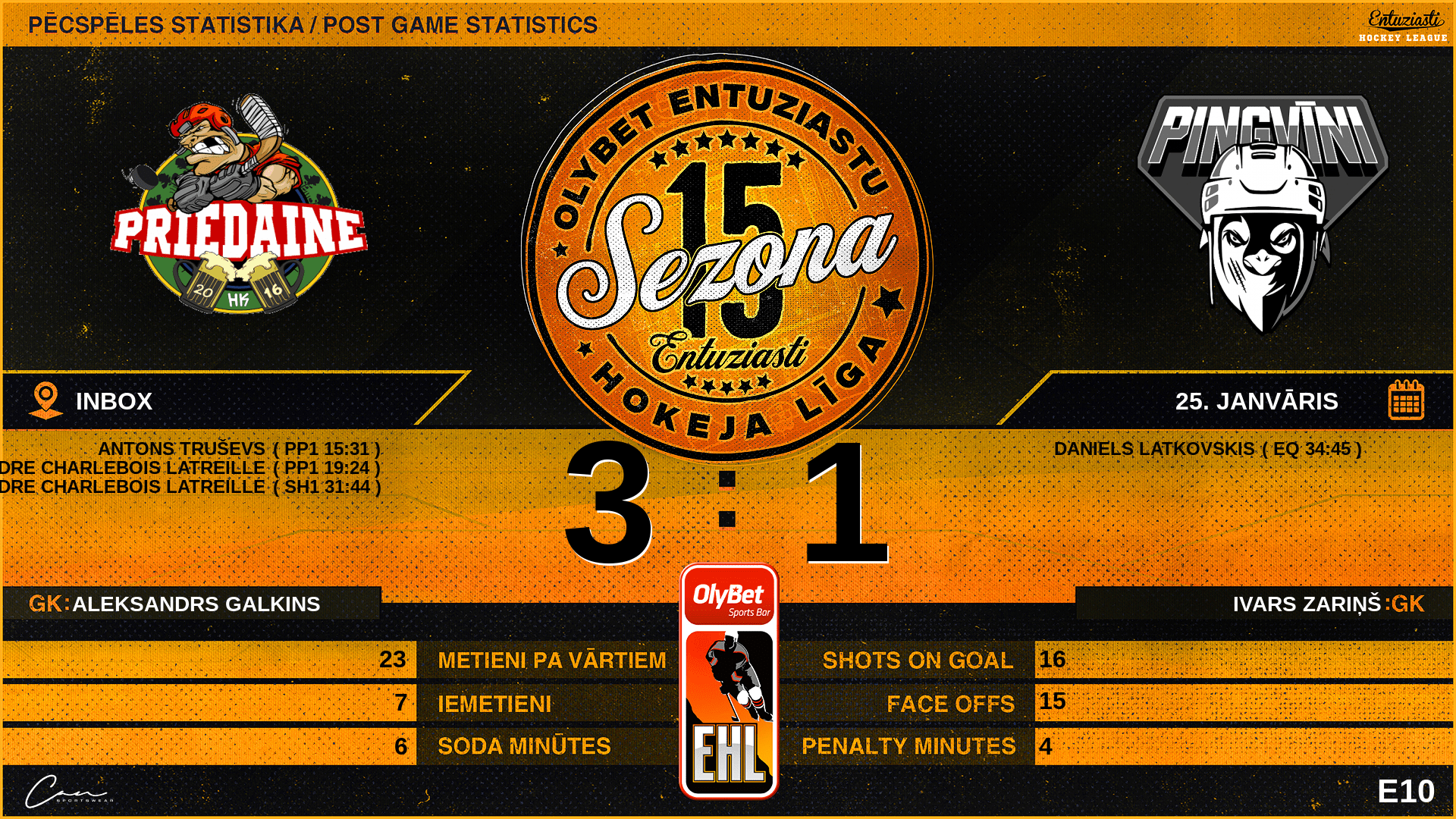 | 34:45 | PNX | Vārti (EQ) PR2 3 : 1 PNX | #26 Daniels Latkovskis, piespēles: #24 Ričards Kumačevs |