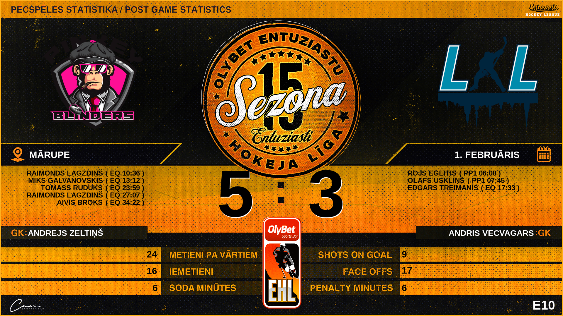 | 06:08 | LST | Vārti (PP1) PB2 0 : 1 LST | #69 Rojs Eglītis, piespēles: #80 Ernests Gorns |