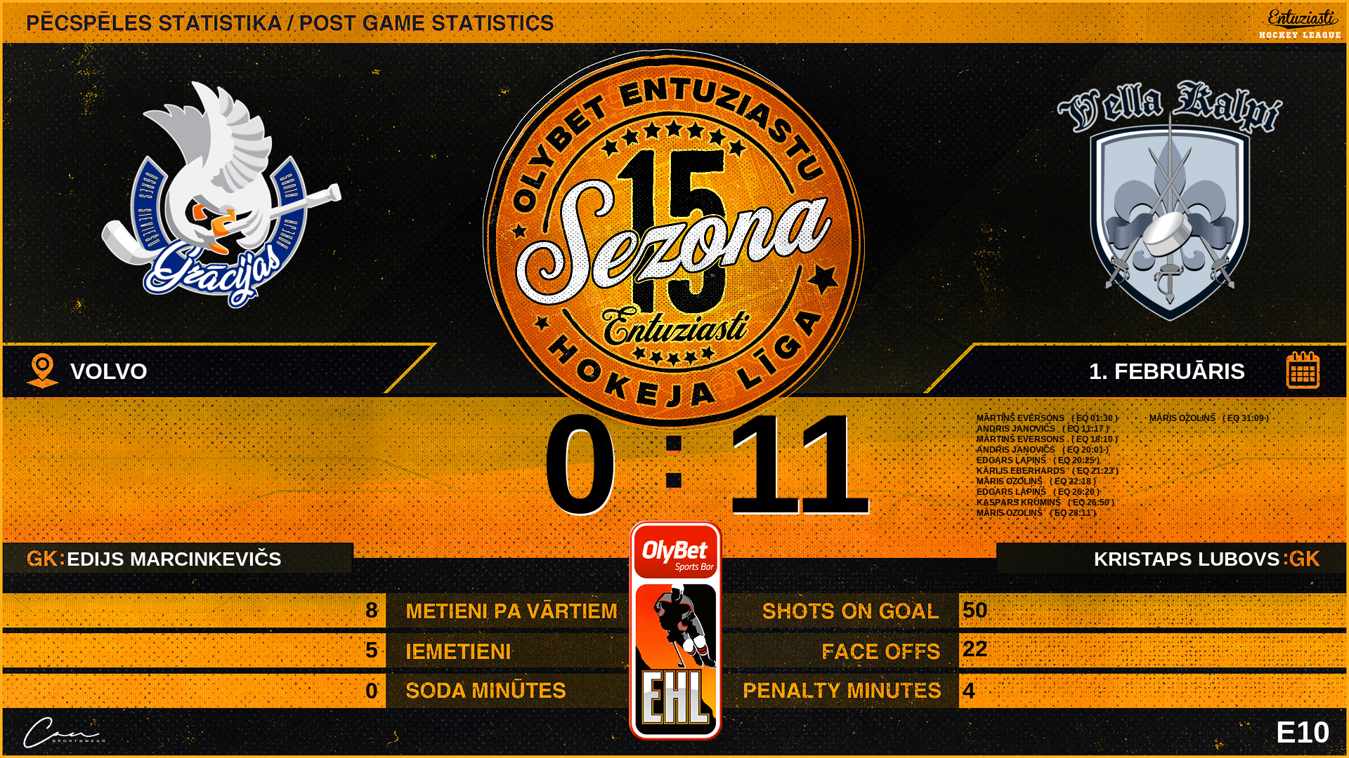 | 31:09 | VL3 | Vārti (EQ) | #57 Māris Ozoliņš, piespēles: #77 Edgars Lapiņš, #8 Kārlis Eberhards |