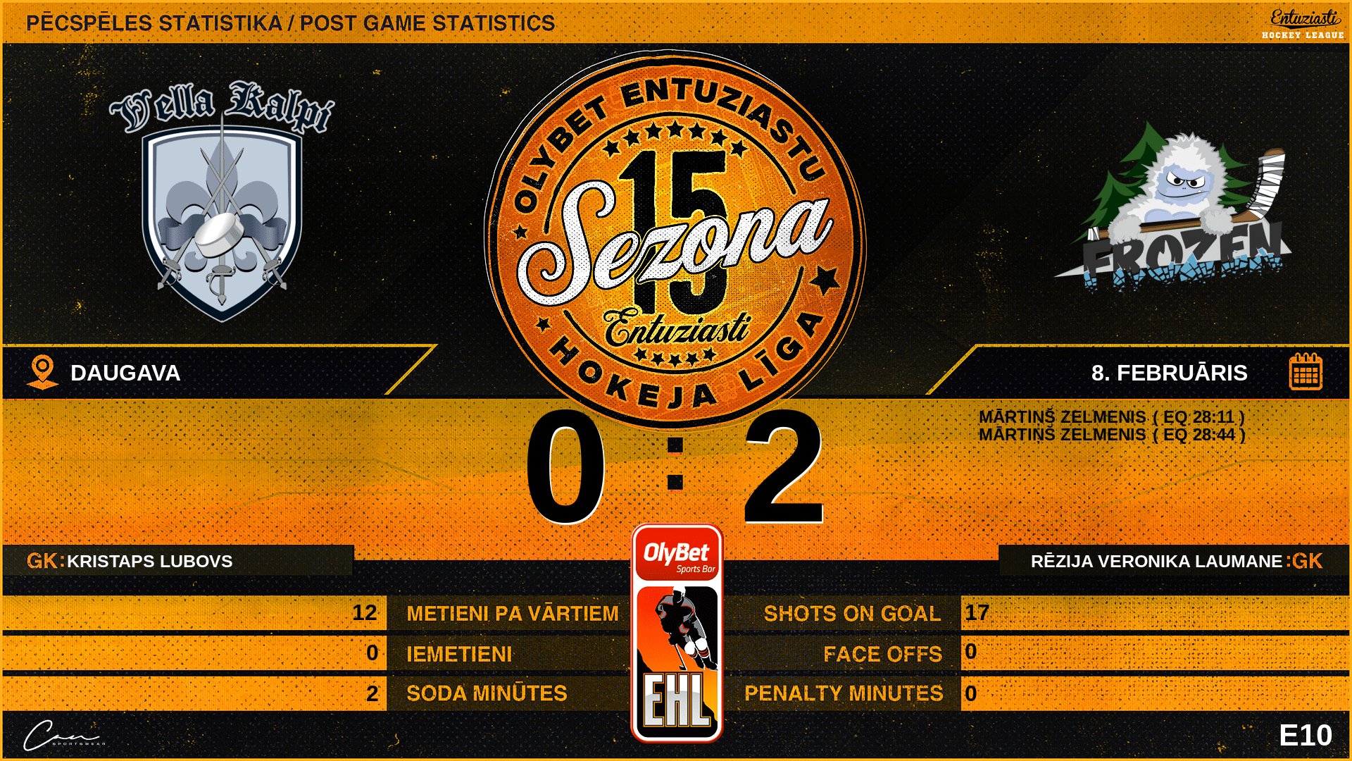 | 28:11 | FRZ | Vārti (EQ) | #84 Mārtiņš Zelmenis, piespēles: #14 Jānis Kramiņš, #19 Henrijs Lapkasis |