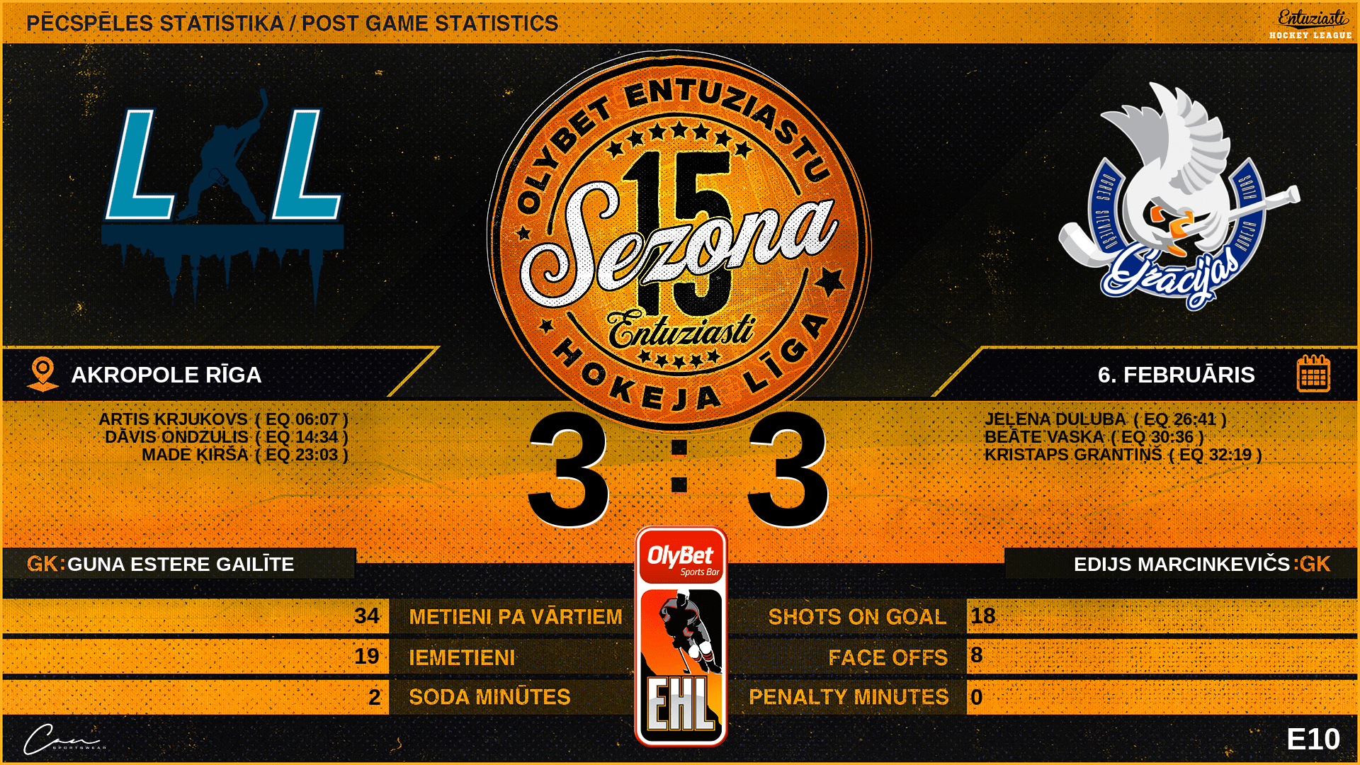 | 14:34 | LDS | Vārti (EQ) | #70 Dāvis Ondzulis, piespēles: #2 Rebeka Bernāne |