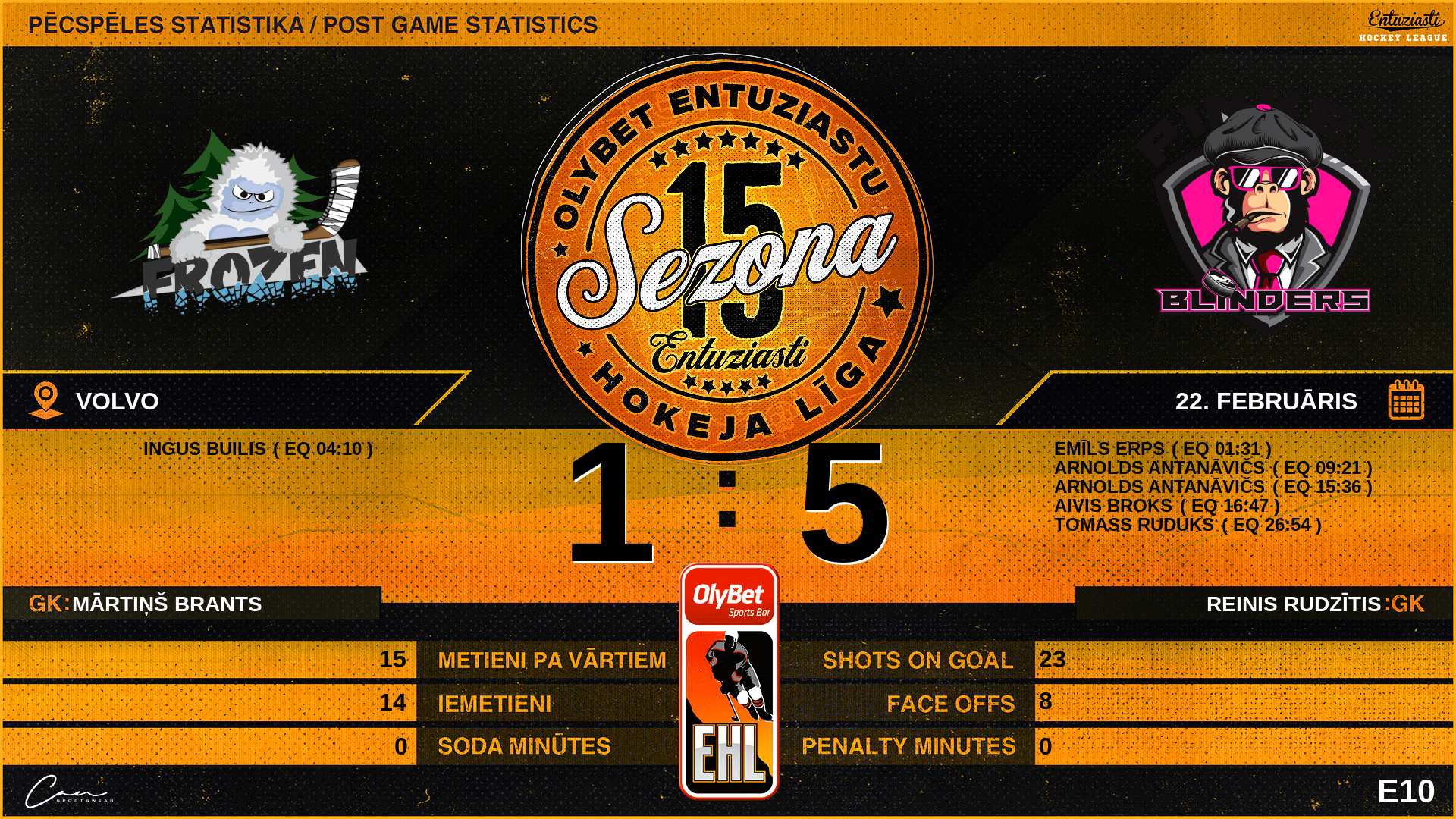 | 15:36 | PB2 | Vārti (EQ) FRZ 1 : 3 PB2 | #5 Arnolds Antanāvičs, piespēles: #50 Emīls Erps |
