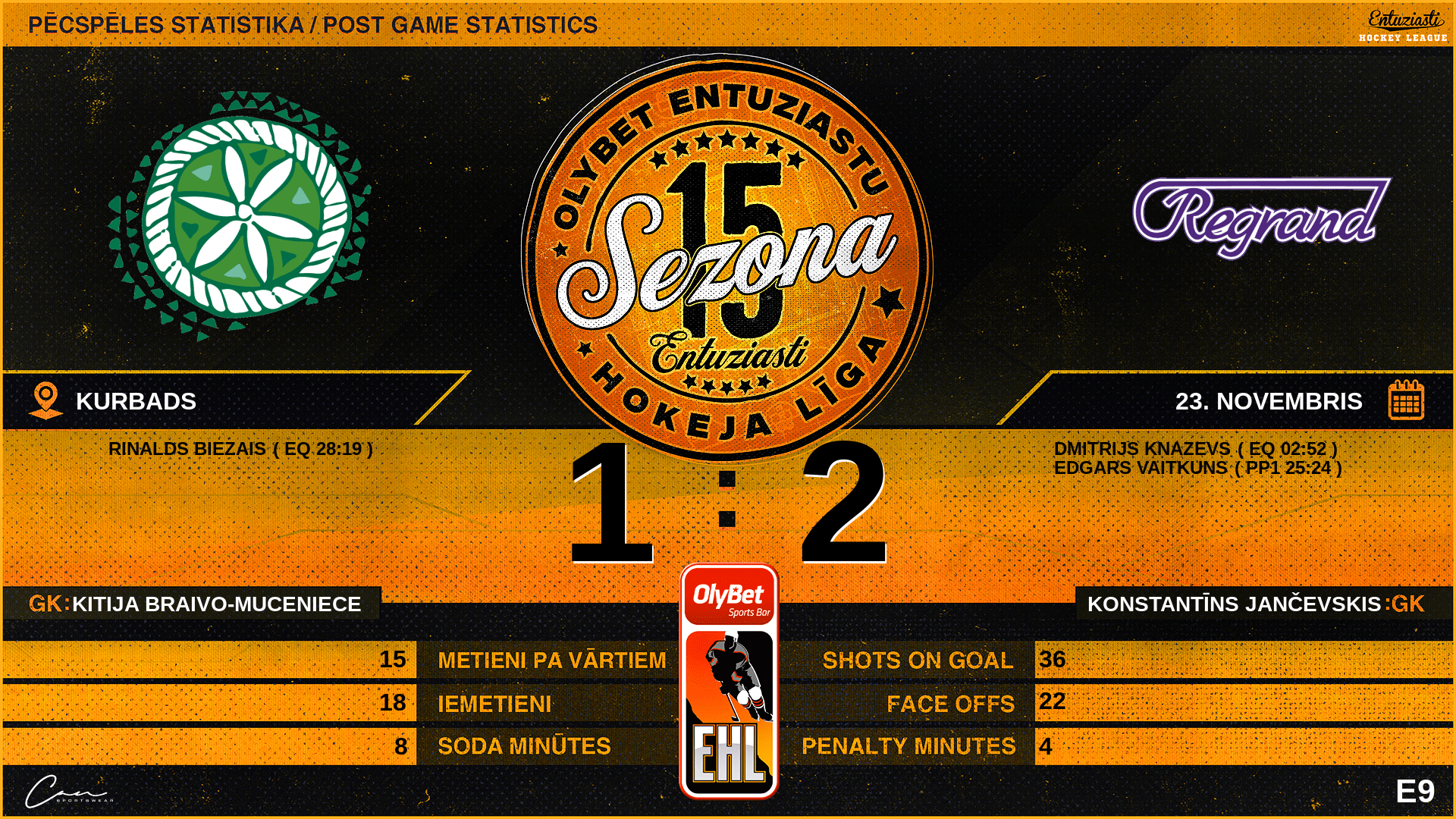 | 28:19 | PC2 | Vārti (EQ) | #24 Rinalds Biezais, piespēles: #21 Dāvis Adomaitis, #83 Guntars Lazdiņš |
