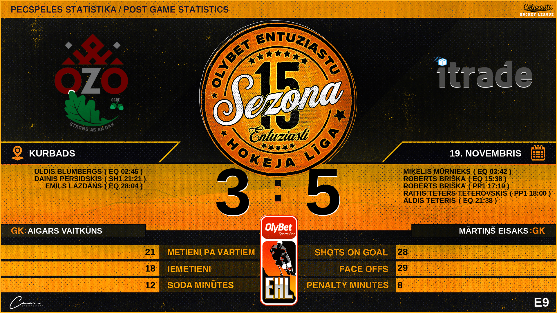 | 18:00 | ITR | Vārti (EQ) | #7 Raitis Teters Teterovskis, piespēles: #17 Jānis Ušča |
