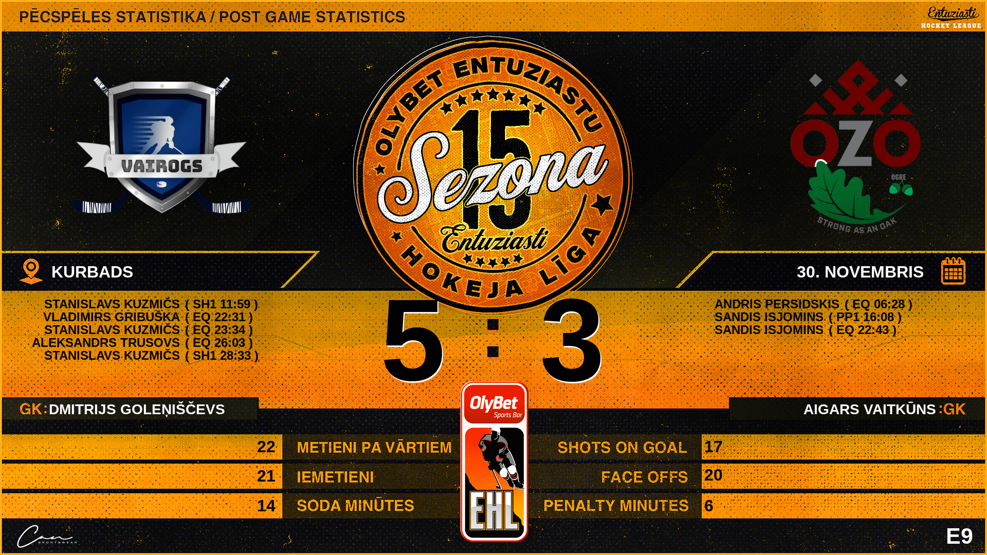 | 22:43 | OZG | Vārti (EQ) | #8 Sandis Isjomins, piespēles: #17 Emīls Kronentāls |