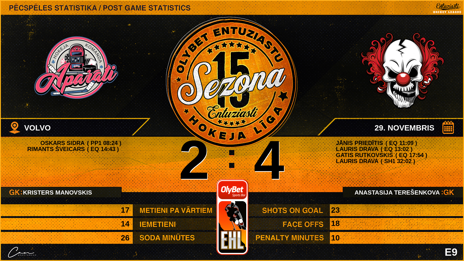 | 14:43 | APR | Vārti (EQ) | #35 Rimants Šveicars, piespēles: #2 Oskars Sidra |