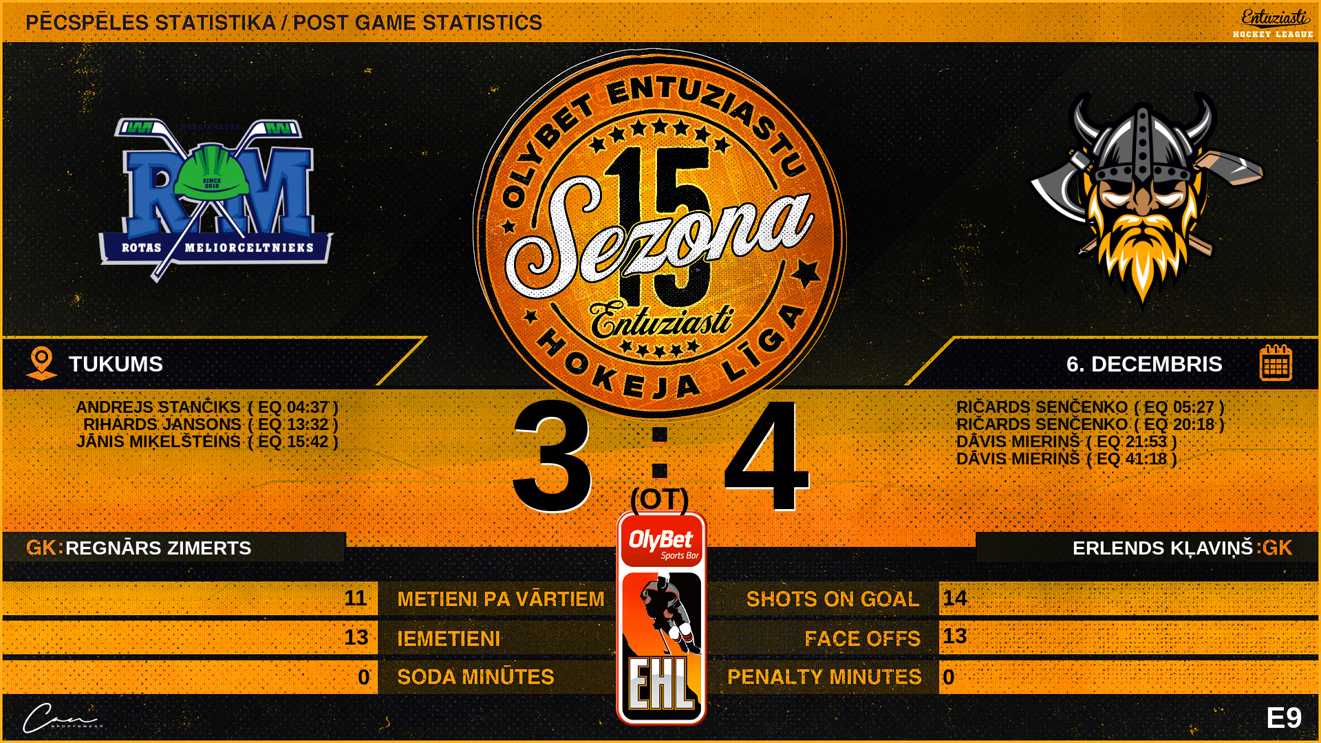 | 15:42 | RT3 | Vārti (EQ) | #27 Jānis Miķelšteins, piespēles: #68 Edgars Meņģelis |