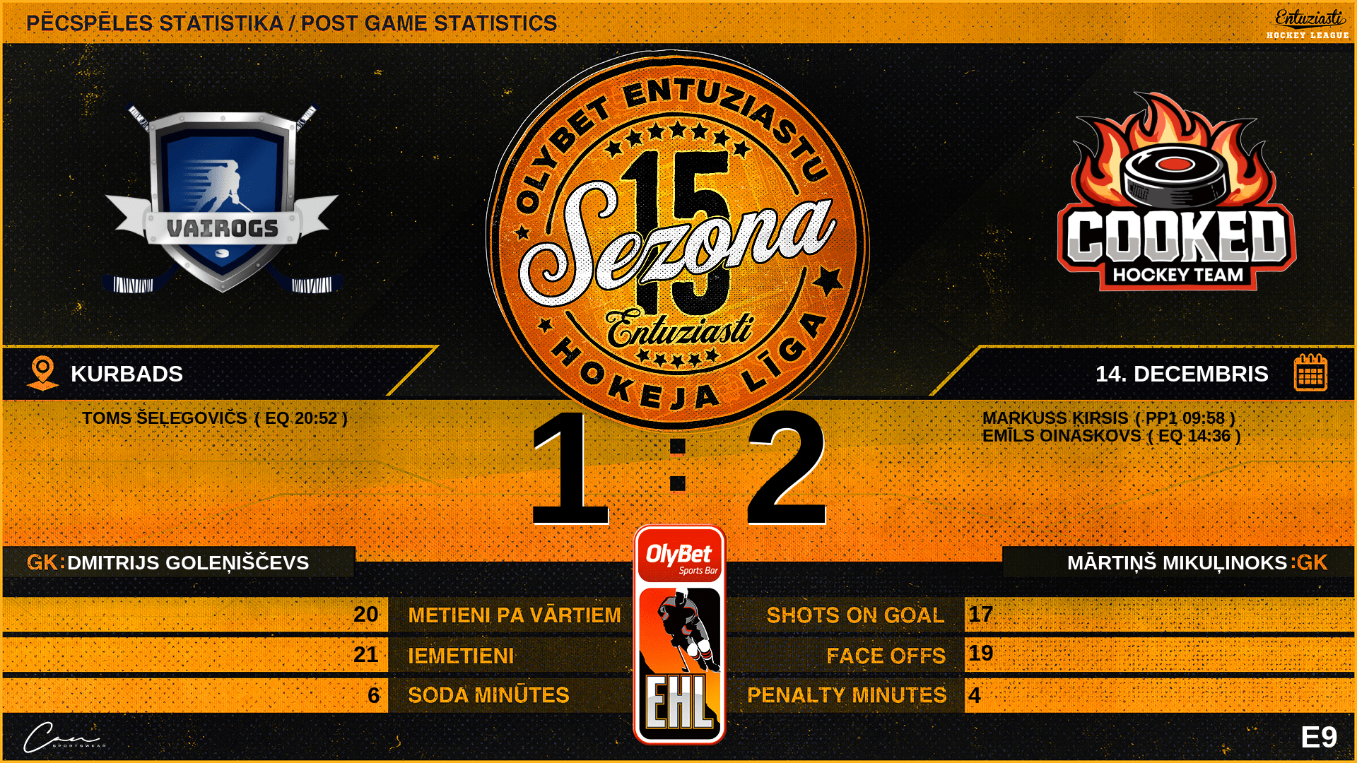 | 14:36 | CKD | Vārti (EQ) | #79 Emīls Oinaskovs, piespēles: #32 Dainis Silājs, #17 Rūdolfs Kažoks |