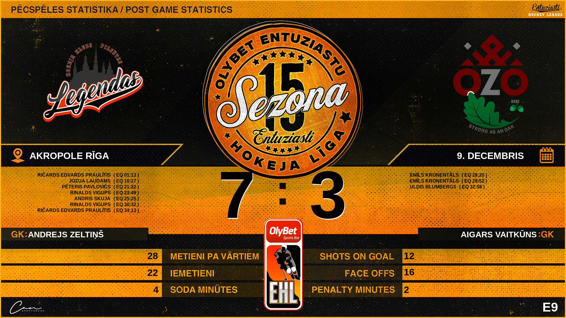 | 28:20 | OZG | Vārti (EQ) | #91 Emīls Kronentāls, piespēles: #21 Didzis Stivriņš, #22 Kristaps Cepurītis |