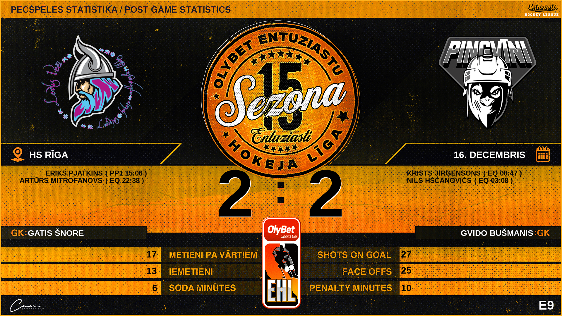 | 15:06 | LV2 | Vārti (PP1) | #49 Ēriks Pjatkins |
