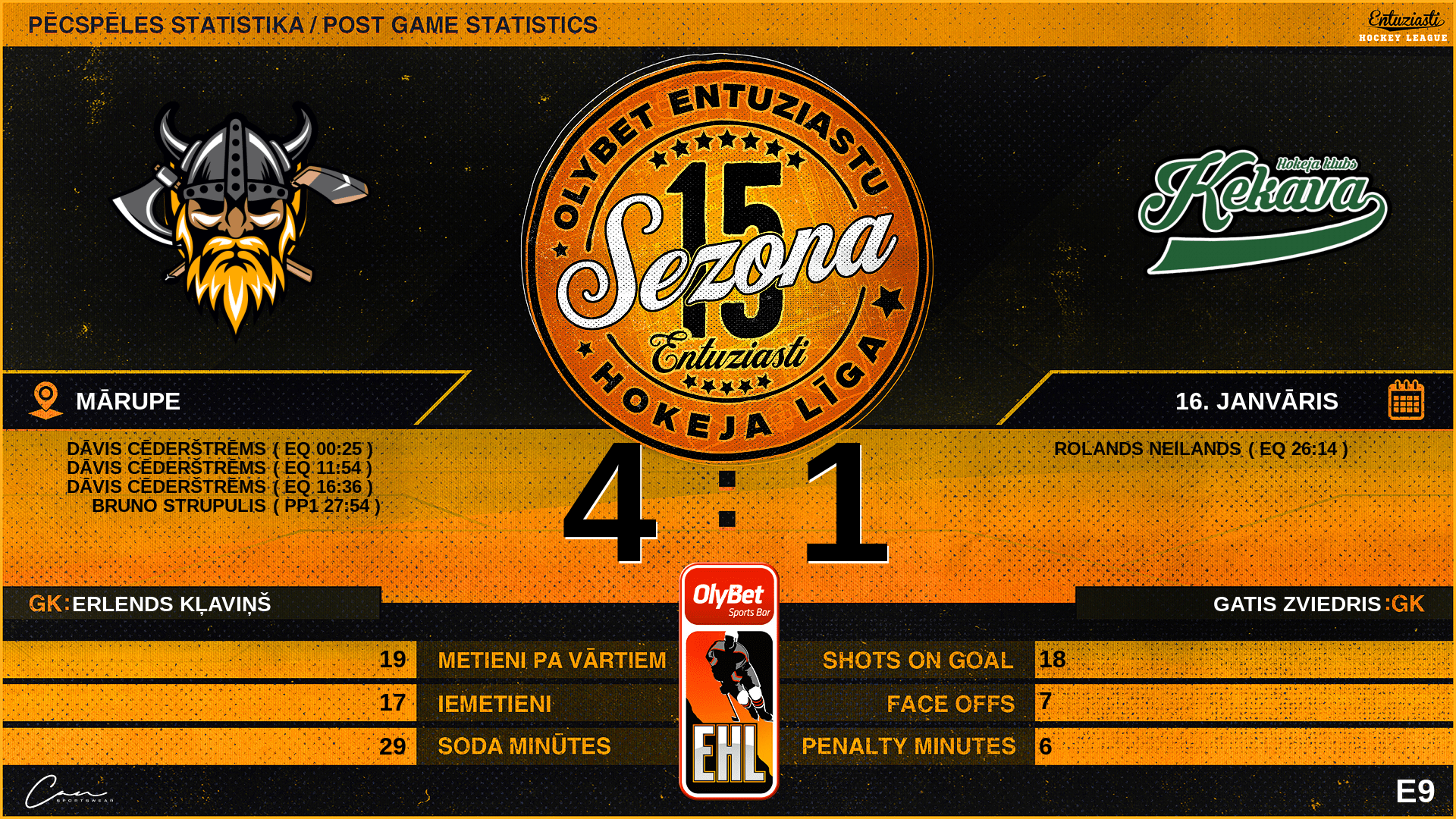 | 16:36 | VN3 | Vārti (EQ) | #68 Dāvis Cēderštrēms, piespēles: #95 Gvido Laminskis, #99 Haralds Apinis |
