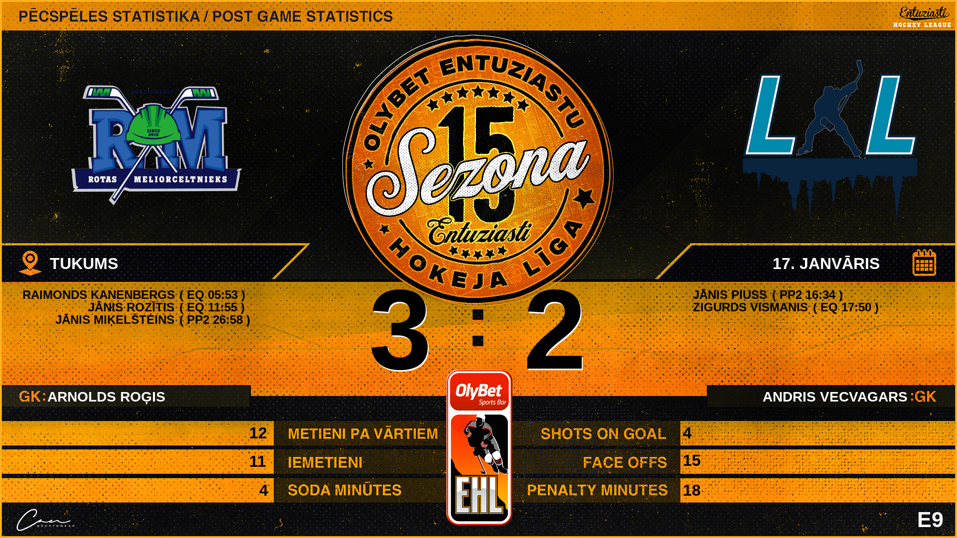 | 17:50 | LLS | Vārti (EQ) | #14 Zigurds Vismanis, piespēles: #67 Alberts Šakels |
