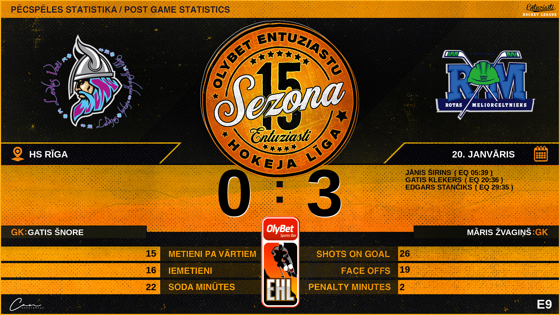 | 29:35 | RT3 | Vārti (EQ) | #41 Edgars Stančiks, piespēles: #84 Rihards Sležis, #23 Gatis Klekers |