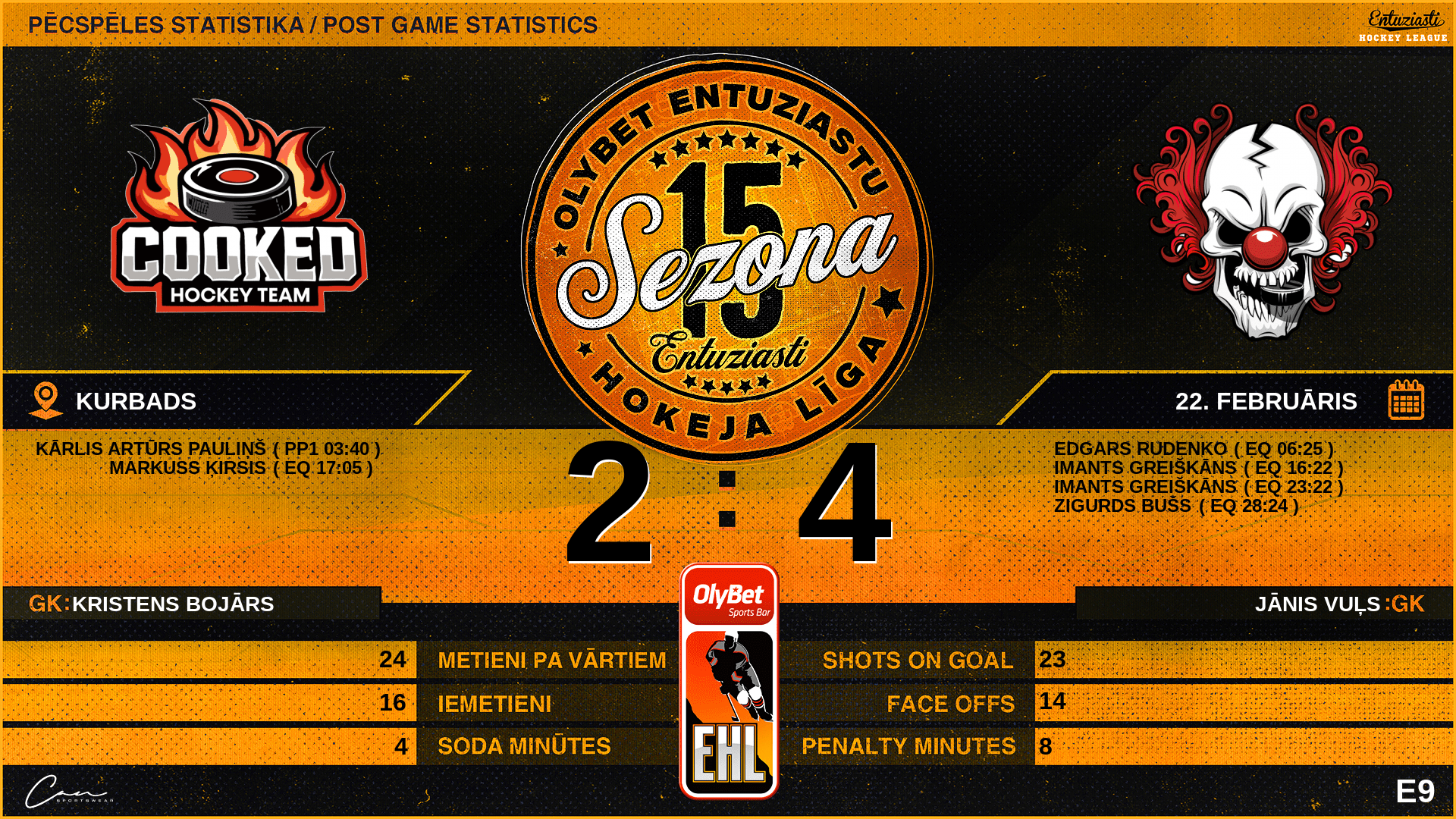 | 22:37 | CKD | Noraidījums | #88 Rauls Kalvītis - Unsportsmanlike conduct (2 min) |