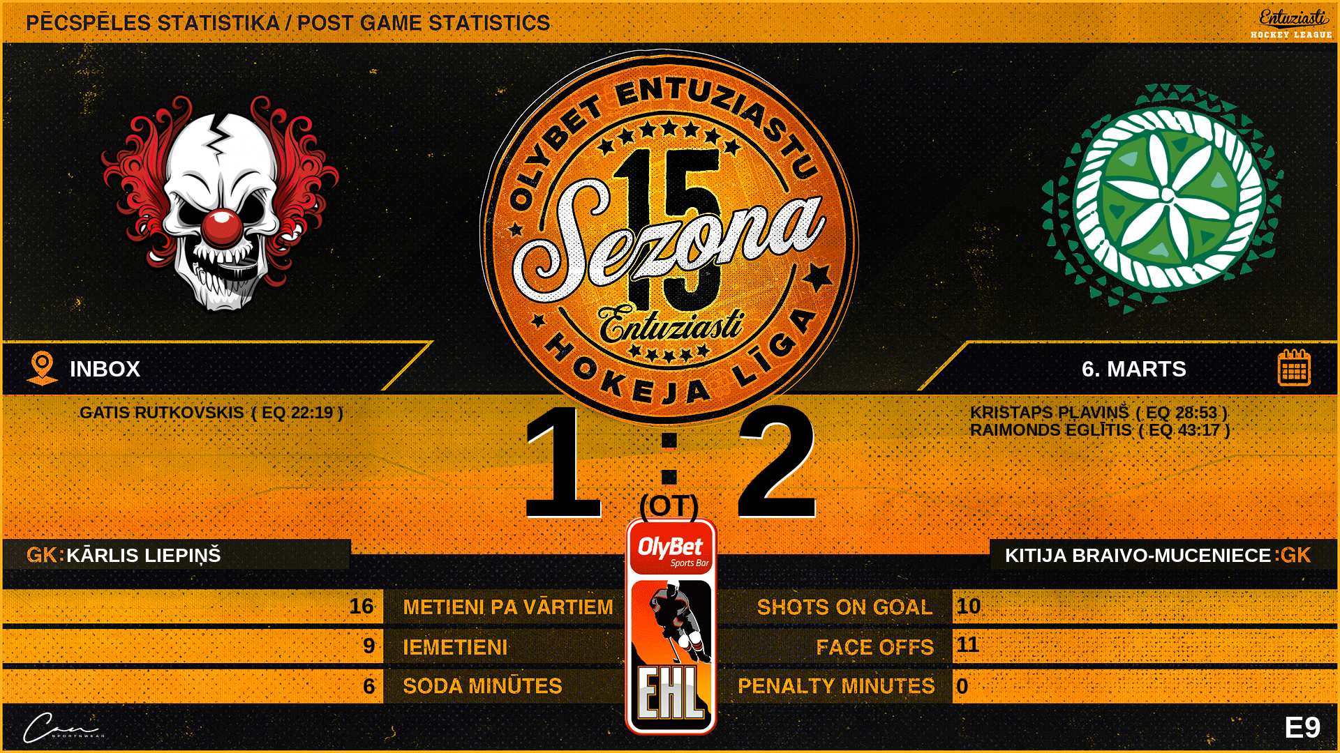 | 28:53 | PC2 | Vārti (EQ) CRK 1 : 1 PC2 | #80 Kristaps Pļaviņš, piespēles: #47 Raimonds Eglītis, #72 Ēriks Červinskis |