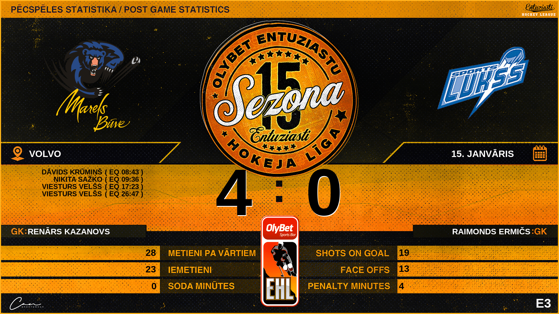 | 17:23 | MBV | Vārti (EQ) | #23 Viesturs Velšs, piespēles: #82 Nikita Beločickis, #21 Ingus Matiņš |