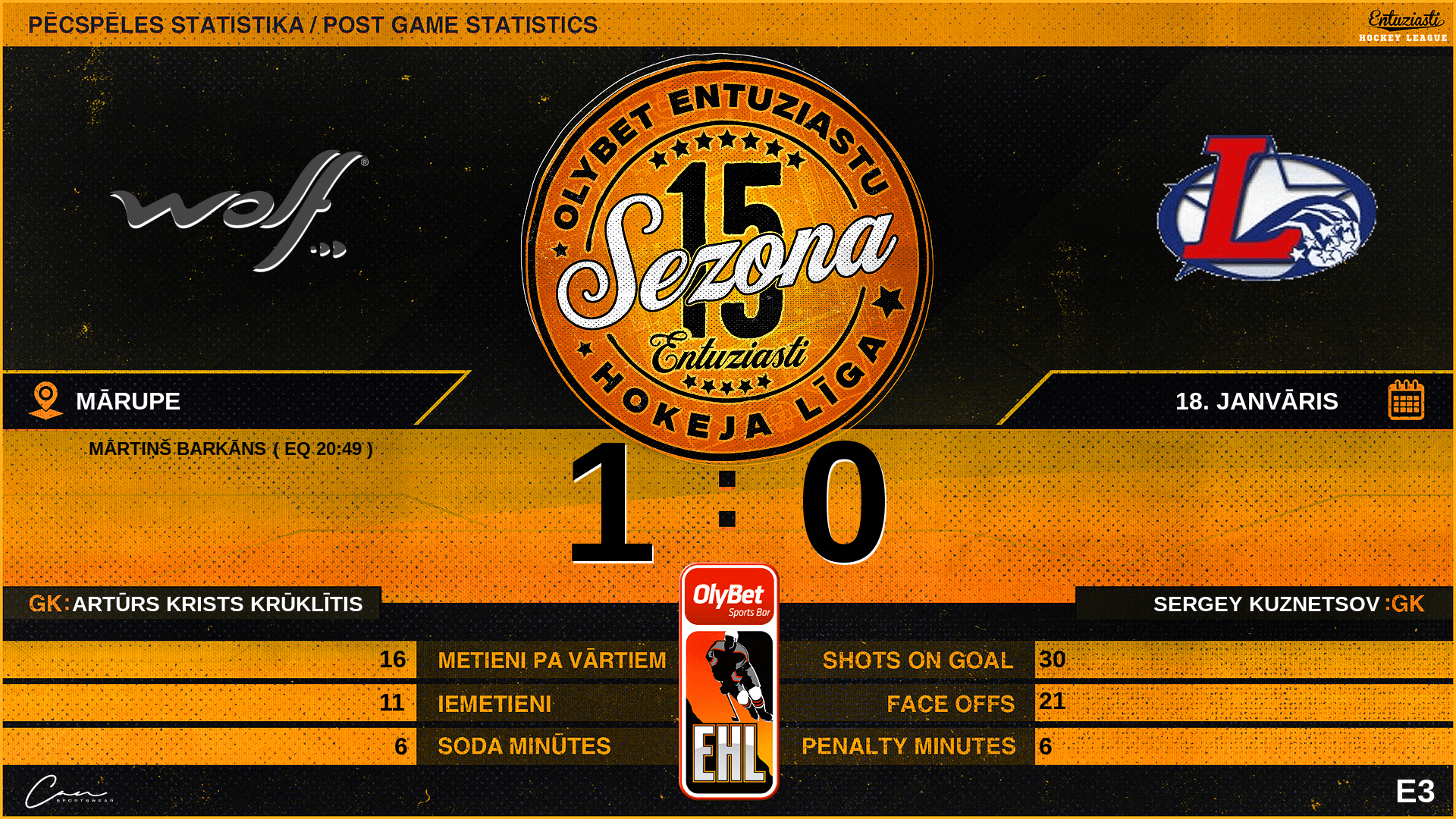 | 20:49 | WL2 | Vārti (EQ) | #46 Mārtiņš Barkāns, piespēles: #97 Valts Peleckis |