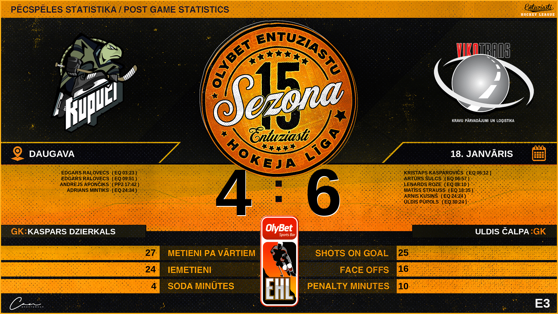 | 30:24 | VKT | Vārti (EQ) | #23 Uldis Pūpols, piespēles: #69 Lenards Roze |