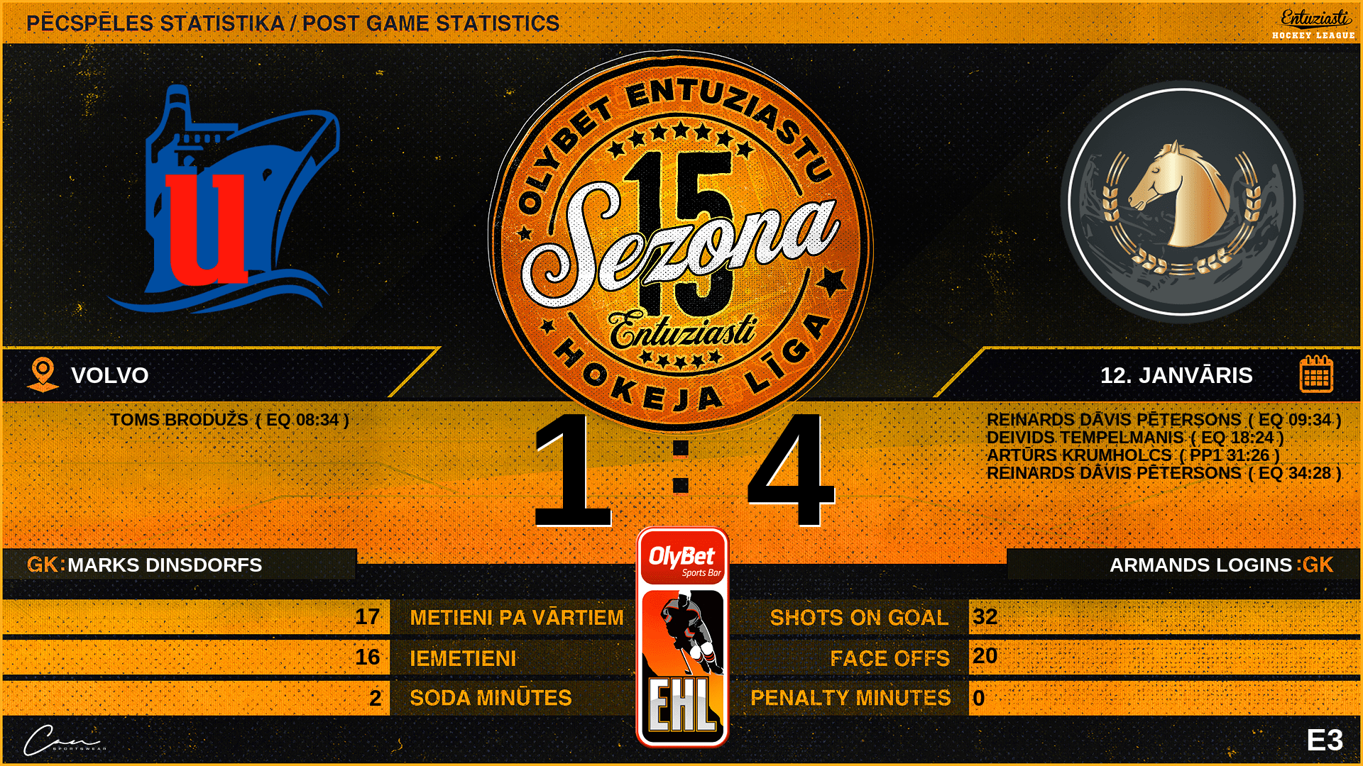 | 09:34 | TRV | Vārti (EQ) | #17 Reinards Dāvis Pētersons, piespēles: #49 Jēkabs Bisnieks, #10 Kristers Stankevičs |