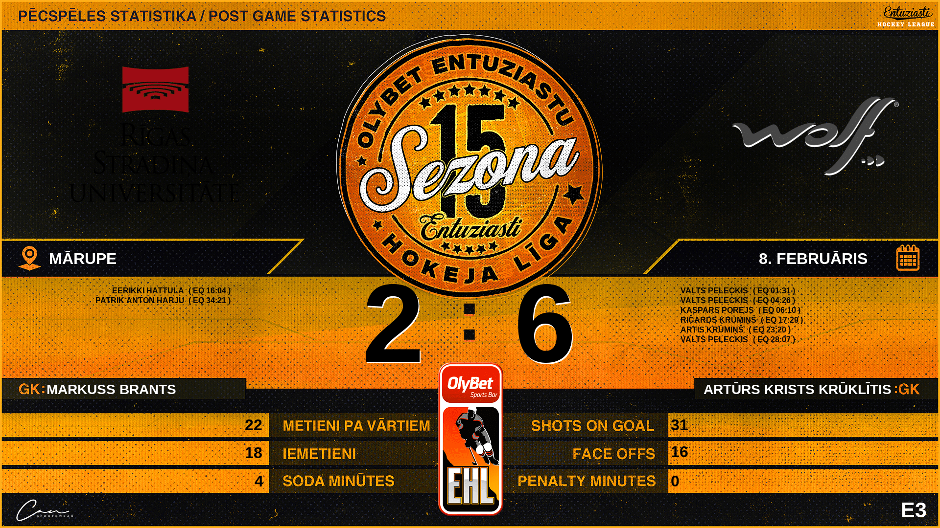 | 34:21 | RSU | Vārti (EQ) RSU 2 : 6 WL2 | #72 Patrik Anton Harju, piespēles: #31 Kristiāns Upmalis, #92 Oskar Pettersson |