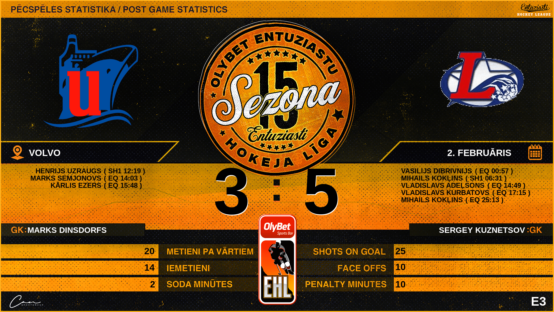 | 15:48 | UNI | Vārti (EQ) | #77 Kārlis Ezers, piespēles: #26 Sandis Auziņš |