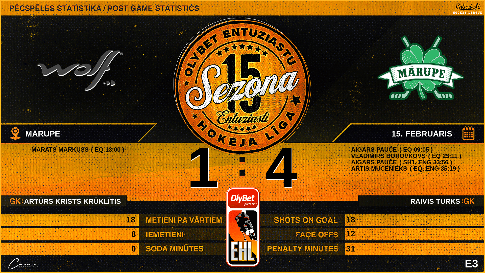 | 35:19 | MRP | Vārti (EQ, ENG) WL2 1 : 4 MRP | #91 Artis Mucenieks, piespēles: #81 Kārlis Plūme, #28 Vladimirs Borovkovs |