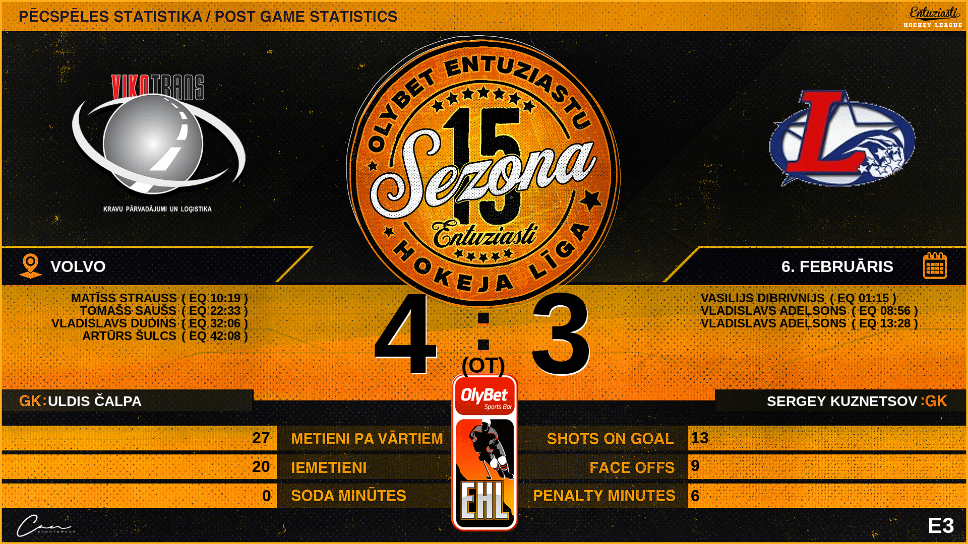 | 22:33 | VKT | Vārti (EQ) | #16 Tomašs Saušs, piespēles: #50 Silvestrs Kūliņš, #96 Dmitrijs Šancovojs |