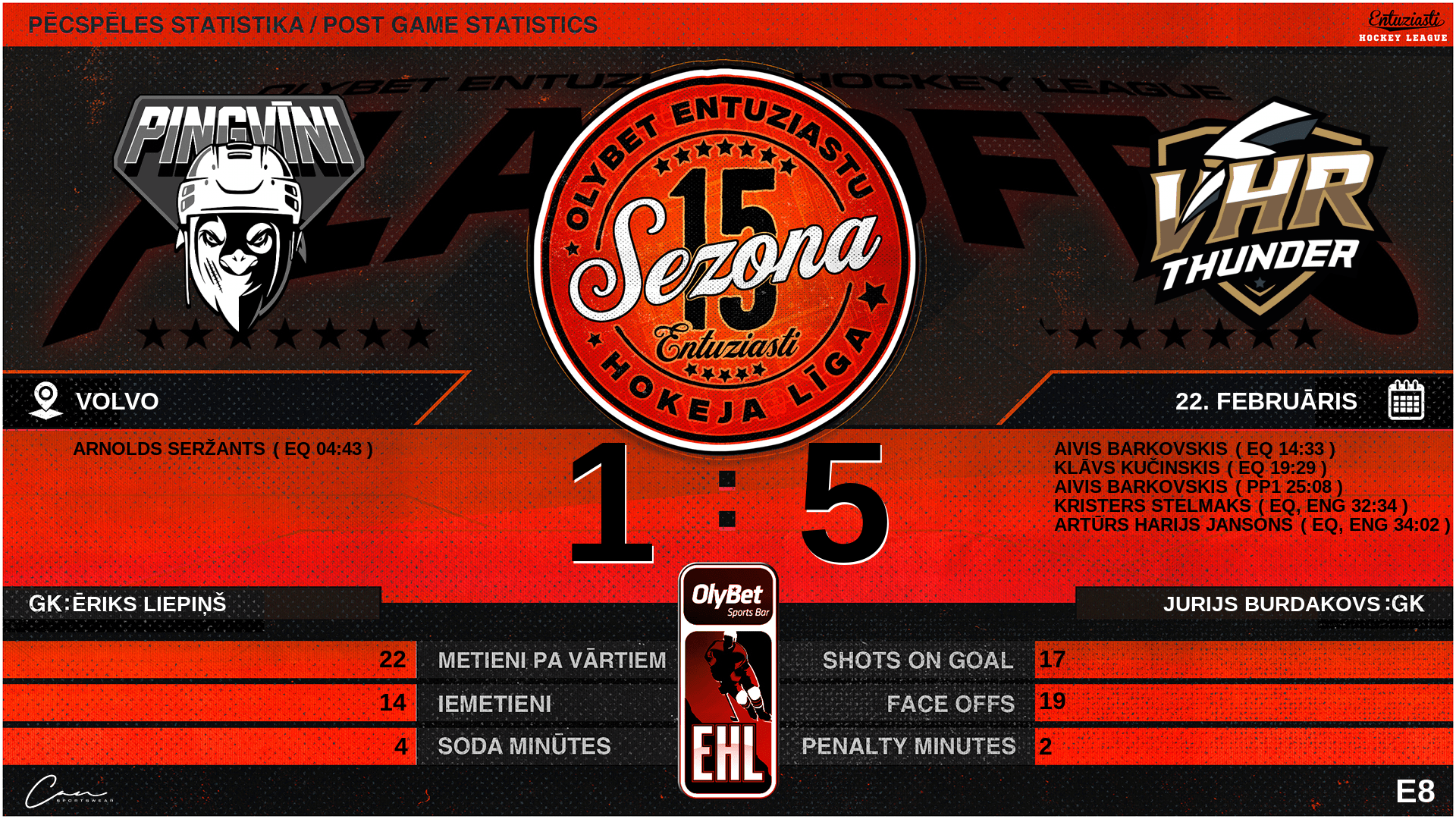 | 25:08 | VHR | Vārti (PP1) PNG 1 : 3 VHR | #8 Aivis Barkovskis, piespēles: #23 Oskars Vāvers, #61 Valdis Jānis Vāvers |