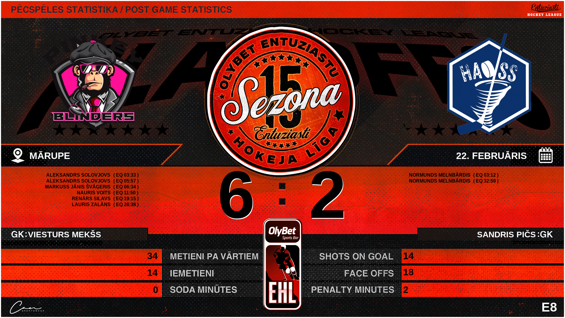 | 06:34 | PNB | Vārti (EQ) PNB 3 : 1 HA2 | #37 Markuss Jānis Švāģeris, piespēles: #12 Edijs Krists Kudors |